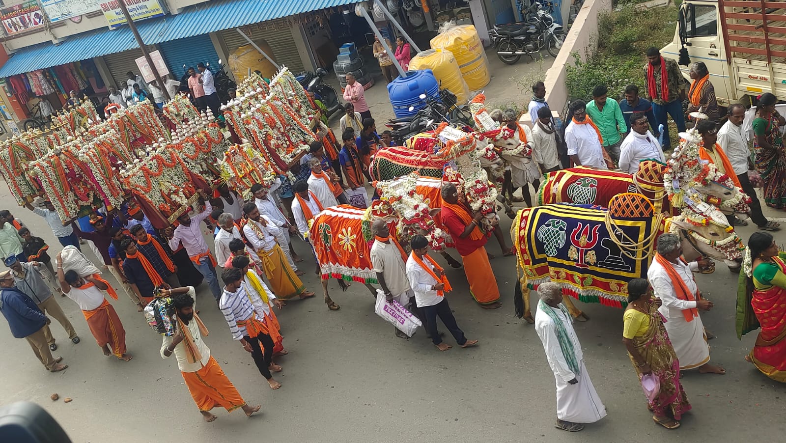 முன்னதாக தேன்கனிக்கோட்டை நகரின் முக்கிய வீதிகள் வழியாக அலங்கரிக்கப்பட்ட பல்லக்கில் கனகதாசர் சிலை வைக்கப்பட்டு மேளதாளங்கள் முழங்க டொல்லு குணிதா, வீரகாசை, விரபத்ர குணிதா ஆகிய பாரம்பரிய நடனங்களுடன் சிக்கம்மா, தொட்டம்மா, வீரபத்ரப்பா உள்ளிட்ட 20க்கும் மேற்பட்ட கிராம தேவதைகள் அலங்கரிக்கப்பட்ட காளை மாடுகளுடன் ஊர்வலமாக கொண்டு செல்லப்பட்டன. இதில் பக்தர்கள் பாரம்பரிய முறையில் நடனங்கள் ஆடினர். அப்போது ஊர்வலம் சென்ற சாலைகளில் தேங்காய்கள் உடைக்கப்பட்டன.