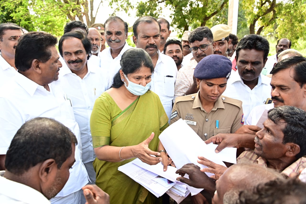 தூத்துக்குடி விமான நிலையத்தில் திமுக துணைப் பொதுச் செயலாளரும் எம்.பியுமான கனிமொழி மழை வெள்ளத்தால் பாதிக்கப்பட்ட விவசாயிகளை நேரில் சந்தித்து கோரிக்கை மனுக்களைப் பெற்றார்.