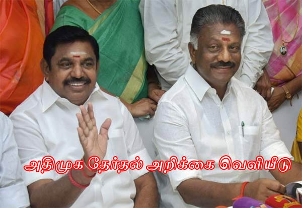 இந்த நிலையில், அ.தி. மு.க.வின் தேர்தல் அறிக்கையை, அ.தி.மு.க.வின் இணை ஒருங்கிணைப்பாளரும், முதல்-அமைச்சருமான எடப்பாடி பழனிசாமி, கட்சியின் ஒருங்கிணைப்பாளரும், துணை முதல்-அமைச்சருமான ஓ.பன்னீர்செல்வம் ஆகியோர் நேற்று மாலை சென்னை ராயப்பேட்டையில் உள்ள அ.தி.மு.க. தலைமை அலுவலகத்தில் வெளியிட்டனர்.