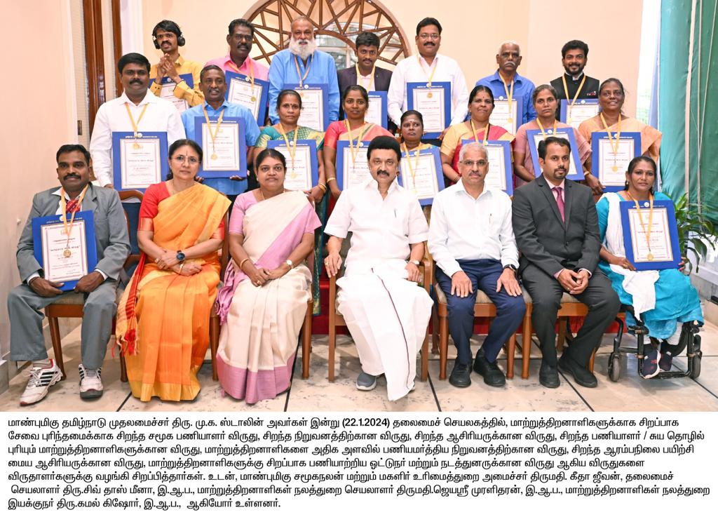 தமிழ்நாடு முதலமைச்சர் ஸ்டாலின் தலைமைச் செயலகத்தில், மாற்றுத்திறனாளிகளுக்காக சிறப்பாக சேவை புரிந்தமைக்காக சிறந்த சமூக பணியாளர் விருது, சிறந்த நிறுவனத்திற்கான விருது, சிறந்த ஆசிரியருக்கான விருது, சிறந்த பணியாளர் சுய தொழில் புரிபவருக்கான விருது, மாற்றுத்திறனாளிகளை அதிக அளவில் பணியமர்த்திய நிறுவனத்திற்கான விருது, சிறந்த ஆரம்பநிலை பயிற்சி மைய ஆசிரியருக்கான விருது, மாற்றுத்திறனாளிகளுக்கு சிறப்பாக பணியாற்றிய ஓட்டுநர் மற்றும் நடத்துனருக்கான விருது ஆகிய விருதுகளை விருதாளர்களுக்கு வழங்கி சிறப்பித்தார்.