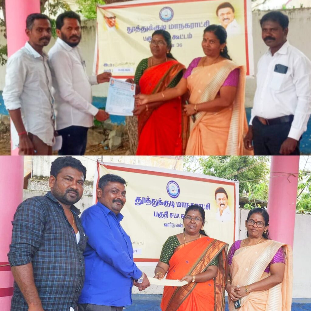 தூத்துக்குடி மாநகராட்சி 36 வது தனி வார்டு பகுதி சபா கூட்டம் இன்று (01.02.2024 ) நடைபெற்றது. இக்கூட்டத்தில், போல்டன்புரம் சுப்பையாபுரம், மாசிலாமணிபுரம் பகுதி மக்களுக்கான கழிவு நீர் பிரச்சனைகளை குறித்து எடுத்துக் கூறி சரி செய்யுமாறும், மாசிலாமணிபுரம் 3 வது தெருவில் புதிதாக கட்டப்பட்டு விரைவில் திறக்கப்பட உள்ள பூங்காவிற்கு முன்னாள் நகர் மன்ற உறுப்பினரும், உப்பளத் தொழிலாளர்கள், சுமை தூக்கும் தொழிலாளர்களின் பாதுகாவலராக விளங்கியவரும் ஒருங்கிணைந்த நெல்லை தூத்துக்குடி மாவட்ட திமுகவின் வளர்ச்சிக்கு அளப்பரிய கடமையாற்றிய மிசா எஸ். சித்திரைவேல் பெயரை சூட்ட வேண்டும் என்றும், இந்த கோரிக்கையை தீர்மானத்தில் ஏற்ற வேண்டும் என இந்திய குடியரசு கட்சியின் தூத்துக்குடி மாவட்ட தலைவர் ரத்தினசாமி மற்றும் தமிழ்நாடு பறையர் பாதுகாப்பு பேரவை நிறுவன தலைவர் இளவரச பாண்டியன் மற்றும் விழித்தெழு இளைஞர் நல சங்கம் தலைவர் பிரதீப் ஜேசுதாஸ் உள்ளிட்ட பலர் தூத்துக்குடி மாநகராட்சி சார்பில் பங்கேற்ற மாநகர் நல அலுவலர் சுமதியிடம் மனு அளித்தனர்.