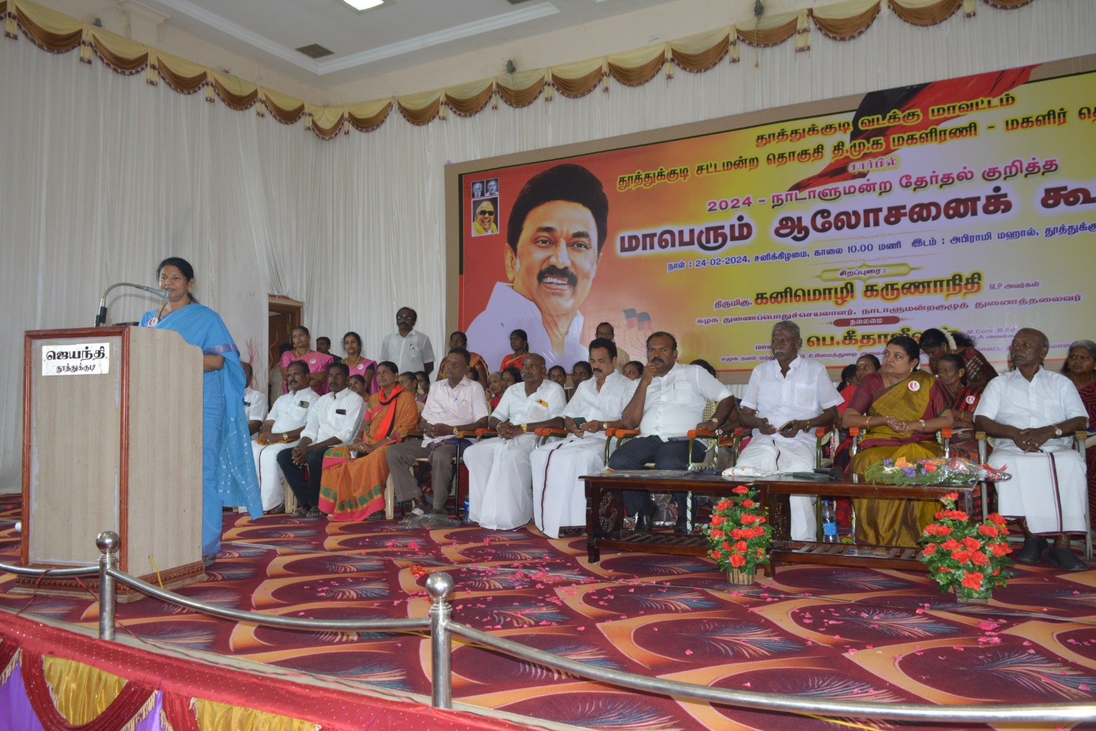 திமுக துணைபொதுச்செயலாளரும் தூத்துக்குடி எம்.பியுமான கனிமொழி பெண்கள் அனைவருக்கும் சேலை வழங்கி பேசுகையில் இந்த அரங்கம் நிறைந்த கூட்டத்தை பாா்க்கும் போது தமிழகம் புதுச்சோி உள்ளிட்ட 40 தொகுதிகளிலும் நமது கூட்டணி வெற்றி உறுதியாகிவிட்டது. திராவிட மாடல் ஆட்சி மகளிர்கான ஆட்சிதான் ஏனென்றால் தமிழக முதலமைச்சராக பொறுப்பேற்ற நமது தலைவர் ஸ்டாலின் முதல் கையெழுத்து பெண்கள் அரசு பேருந்துகளில் இலவச பயணம், மேற்கொள்ளலாம் என்று கையெழுத்திட்டார். யாரையும் எதிர்பார்க்காமல் இந்த பொறுப்பை முதலமைச்சர் ஏற்றுக்கொண்டார். பெண்கள் ஆண்களை எதிர்பாா்க்காமல் தனது தாய் தந்தையரை பார்க்க மட்டுமின்றி அவசர நிமித்தமாக மற்ற பணிகளுக்கு செல்வதற்கு இந்த இலவச பேருந்து பயணம் அமைகிறது. இதன் மூலம் ஓவ்வொரு பெண்களுக்கும் மாதம் 888ரூபாய் மிச்சப்படுகிறது. வீட்டில் முடங்கி கிடப்பவர்களுக்கு எழுச்சியுட்டும் பணியை முதலமைச்சர் செய்து கொடுத்துள்ளார். கலைஞர் ஆட்சியில் 10ம்வகுப்புவரைபெண்கள் படிக்க வேண்டும் என்று கூறியது மட்டுமின்றி திருமண உதவி தொகை வழங்கினார். தற்போது தமிழக முதல்வர் அதனை யும் தாண்டி எல்லா பெண்களும் கல்லூாி படிப்ைப தொடர வேண்டும் என்பதற்காக புதுமைப்பெண் திட்டத்தின் கீழ் ஆயிரம் கல்வி உதவித்தொகை வழங்குகிறார். உங்கள் உழைப்புக்கு அங்கீகாரம் அளிக்கும் வகையில் கலைஞர் மகளிர் உாிமைத் தொகை திட்டத்தின் கீழ் 1000வீதம் 1 கோடியே 15லட்சம் பெண்களுக்கு வழங்கப்பட்டு வருகிறது. மாவட்டத்தில் எதிர்பாராத மழை வௌ்ளத்தால் பொதுமக்கள் விவசாயிகள் மீனவர்கள் வியாபாாிகள் என பல்வேறு தரப்பினர் பாதிக்கப்பட்டனர். அதற்கு நாம் நிதி கோாினோம். பிரதமர் இதுவரை எதுவும் வழங்காமல் இருந்து வருகிறார். இதற்கிடையில் இரண்டு ஓன்றிய அமைச்சர்கள் மற்றும் ஓன்றிய அதிகாாிகள் குழு வந்து பார்வையிட்டு வந்து சென்றுள்ளனர். எதுவும் வழங்காத நிலையில் அனைவருக்கும் நானிருக்கிறேன். என்ற உறுதியை வழங்கி தமிழக முதலமைச்சர் பாதிப்புக்குள்ளானவர்களுக்கு நலத்திட்ட உதவிகள் வழங்குவதற்கு நம்முடைய மாவட்டத்திற்கு நோில் வருகிறார். தமிழக்திலிருந்து பல்ேவறு வகையில் ஓன்றிய அரசு எடுத்துச்செல்லும் வரி வருவாயில் கூட தமிழகத்திற்கு குறைவாகவும் உத்திரபிரதேசத்திற்கு அதிகமாகவும் வழங்கி பிஜேபி அரசு நம்மை வஞ்சித்து வருகிறது. இப்படி பட்ட அரசிற்கு நாம் பாடம் புகட்டியாக வேண்டும். வரும் நாடாளுமன்ற தோ்தலில் சந்தர்ப்பமாக பயன்படுத்திக்கொண்டு ஓட்டு கேட்க வரும் பிஜேபியினாிடம் எங்கள் பணம் எங்கே என்ற கேள்வியை கேட்பது மட்டுமின்றி யார் வரவேண்டும் யார் வரக்கூடாது என்பதில் நாம் தௌிவாக இருக்கும்
