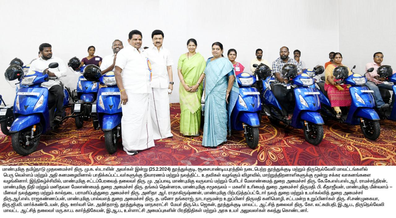 தூத்துக்குடி மற்றும் திருநெல்வேலி மாவட்டங்களில் பெரு வெள்ளம் மற்றும் அதி கனமழையினால் பாதிக்கப்பட்டவர்களுக்கு நிவாரணம் மற்றும் நலத்திட்ட உதவிகள் வழங்கும் நிகழ்ச்சியில் சட்டப்பேரவைத் தலைவர் அப்பாவு, அமைச்சர்கள் ராமச்சந்திரன், தங்கம் தென்னரசு, கீதாஜீவன், அனிதா ராதாகிருஷ்ணன், ராஜகண்ணப்பன், மனோ தங்கராஜ், நாடாளுமன்ற உறுப்பினர் திமுக துணைப் பொதுச் செயலாளர் கனிமொழி கருணாநிதி, சட்டமன்ற உறுப்பினர்கள் சண்முகையா, மார்க்கண்டேயன், ஊர்வசி அமிர்தராஜ், அப்துல் வஹாப், மேயர்கள் ஜெகன் பொியசாமி, சரவணன், தூத்துக்குடி கலெக்டர் லட்சுமிபதி, திருநெல்வேலி கலெக்டர் கார்த்திகேயன், உள்ளாட்சி அமைப்புகளின் பிரதிநிதிகளே, அரசு உயர் அலுவலர்களே, நலத்திட்ட உதவிகளை பெறுவதற்காக வருகை தந்திருக்கக்கூடிய பயனாளிப் பெருமக்களே, திரளாக கூடியிருக்கும் பெரியோர்களே, தாய்மார்களே, பத்திரிகை மற்றும் ஊடகத் துறையைச் சார்ந்திருக்கக்கூடிய நண்பர்களே, என்னுடைய தமிழ்ச் சொந்தங்களே, உங்கள் அனைவருக்கும் என்னுடைய அன்பான வணக்கம்.