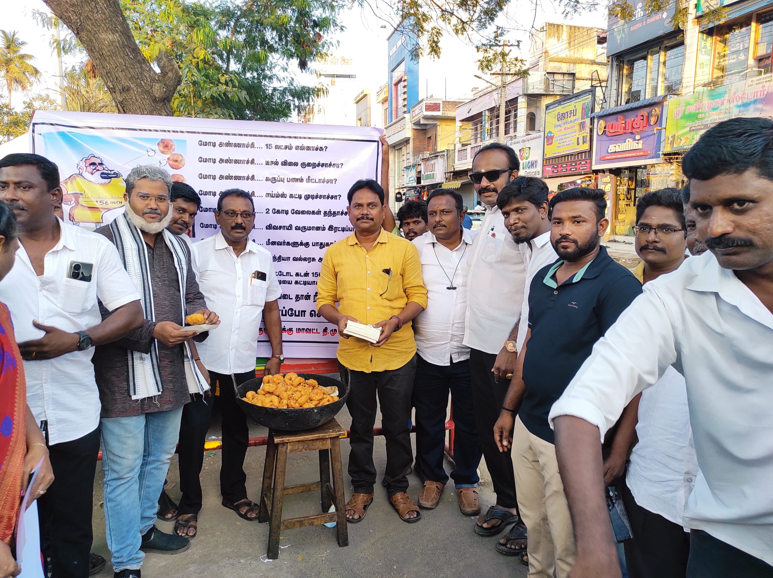 மாநில திமுக தகவல் தொழில்நுட்ப அணி மாநில செயலாளரும் தொழில்துறை அமைச்சருமான ராஜா அறிவுறுத்தலின்படி வடக்கு மாவட்ட திமுக செயலாளர் சமூகநலன் மற்றும் பெண்கள் உாிமைத்துறை அமைச்சர் கீதாஜீவன் வழிகாட்டுதலின்படி தூத்துக்குடி வடக்கு மாவட்ட திமுக தகவல் தொழில்நுட்ப அணி சார்பில் அமைப்பாளர் அபிராமிநாதன் தலைமையில் பழைய அண்ணா பேருந்து நிலையம் முன்பு மோடி கூறிய எந்த வாக்குறுதியையும் நிறைவேற்றாமல் படித்த இளைஞர்களுக்கு வேலை வாய்ப்பு கொடுக்காமல் பக்கோடா விற்று பிழைத்து கொள்ளுங்கள் என்று கூறிய செயல்களையும் கண்டித்து வாயால் வடை சூடுபவர்களுக்கு பாடம் புகட்டும் வகையில் பொதுமக்களுக்கு வடை மற்றும் துண்டு பிரசுரம் பொதுமக்களுக்கு வழங்கி விழிப்புணர்வை ஏற்படுத்தி திமுக ஆட்சி பதவியேற்ற நாளிலிருந்து கொடுத்த வாக்குறுதியை நிறைவேற்றியும் சொல்லாத வாக்குறுதிகளையும் நிறைவேற்றி வரும் முதலமைச்சாின் செயல்திட்டங்களையும் நிதிநிலை அறிக்கையில் அறிவிக்கப்பட்டுள்ள மக்களுக்கான திட்டங்களையும் எடுத்துரைத்தனர்.