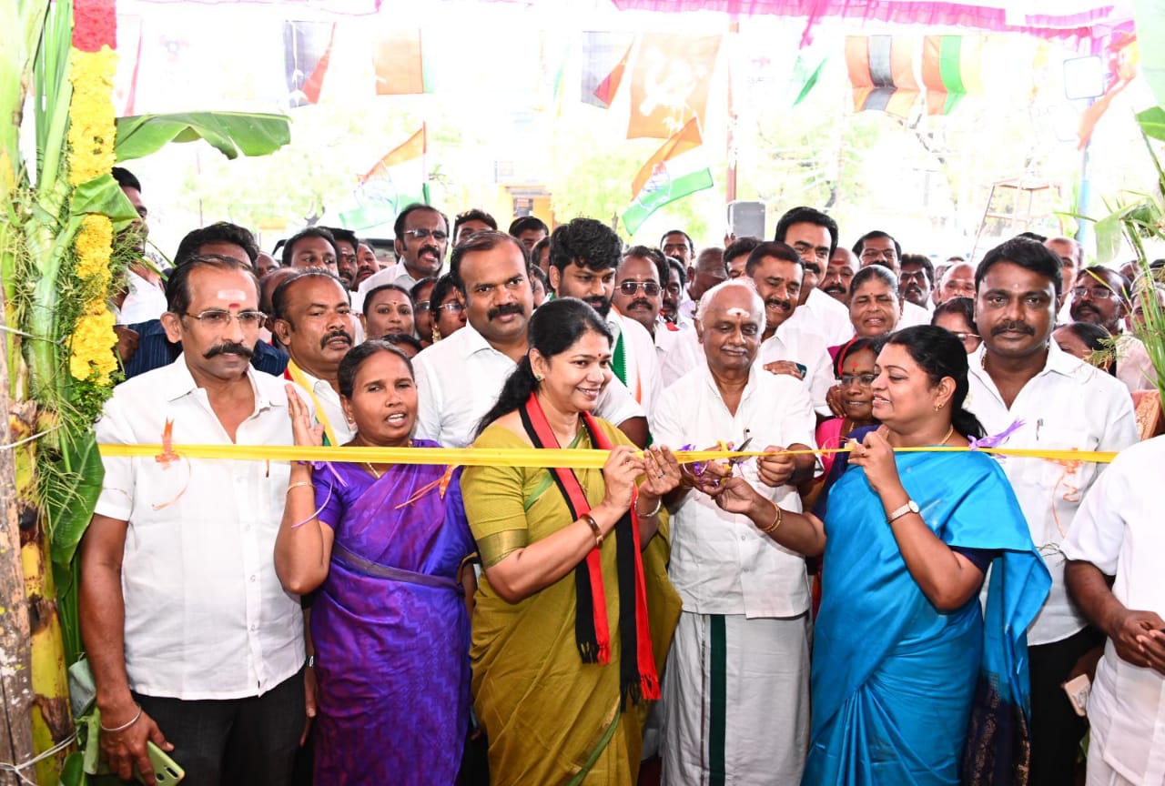 கனிமொழி பாராளுமன்ற தேர்தல் அலுவலகத்தை திறந்து வைத்து இனிப்புகள் வழங்கினார்.