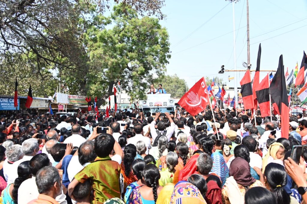 அதிமுக – பாஜக கூட்டணி இல்லை, என்று கூறும் எடப்பாடி, எங்காவது மோடி அரசு பற்றிப் பேசுகிறாரா, இல்லை. இது சட்டமன்ற தேர்தல் என்று நினைத்து நாம் அரசைப் பற்றி எடப்பாடி பழனிசாமி குறை கூறி வருகிறார். சேலத்தில் 2 விவசாயிகள் நிலத்தை பாஜகவினர் அபகரிக்க நினைத்தனர், அவர்கள் நிலத்தைத் தரவில்லை என்றதும் அவர்கள் மீது அமலாக்கத் துறை ஏவி சோதனை செய்தனர்.