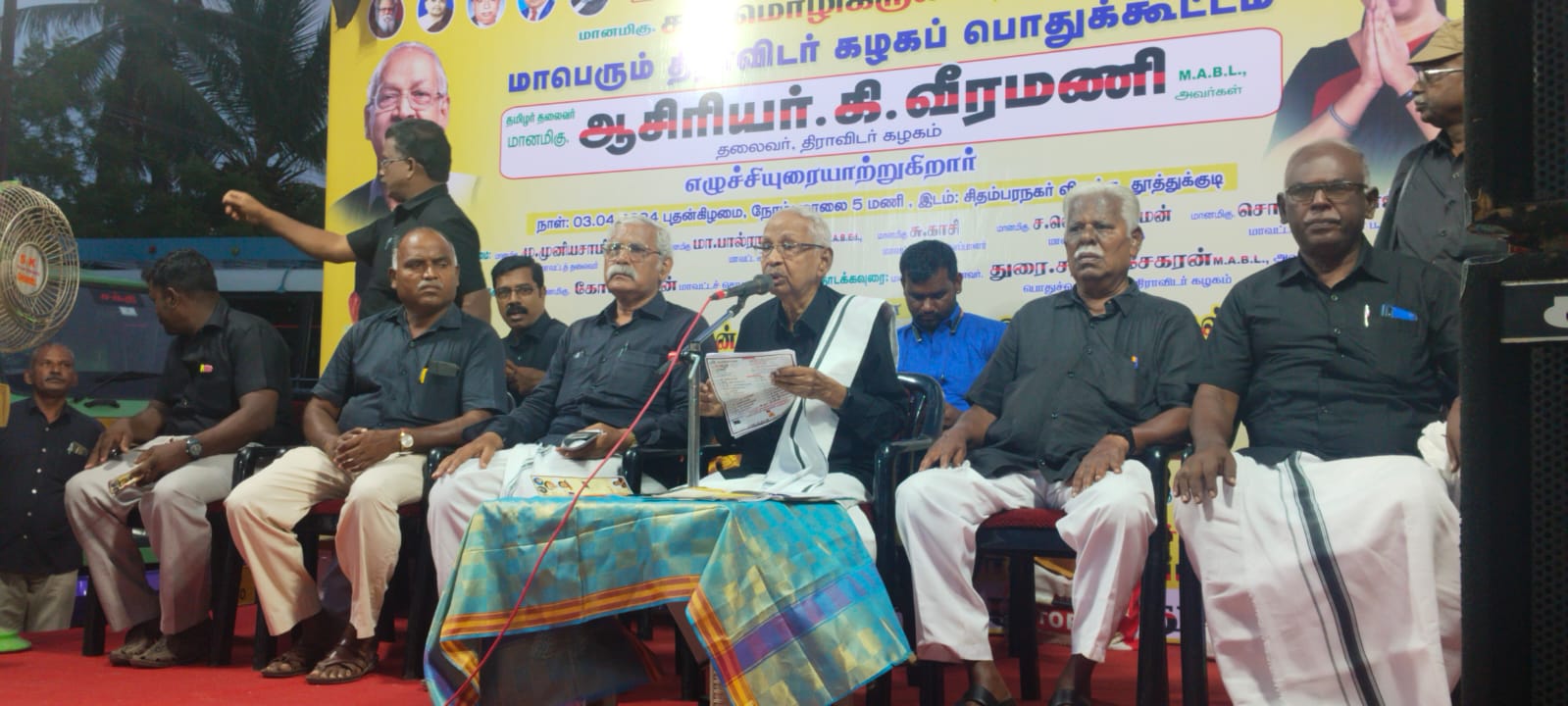 திராவிடர் கழக மாநில தலைவர் கி.வீரமணி பேசுகையில் தந்தை பொியார் காலத்தில் கூட்டத்திற்கு மக்கள் வரவில்லை என்பதைப்பற்றி கவலைப்டாமல் குறைவானவர்கள் வந்தாலும் நாம் சாியான நேரத்திற்கு செல்ல வேண்டும் நமது கொள்கைகள் சென்றடைய வேண்டும் என்ற எண்ணத்தில் பணியாற்றினார். அவரது வழியில் நாம் பயணிக்கிறோம். 10வயது மாணவ பருவ முதல் 80 ஆண்டுகாலம் பொது வாழ்க்கையில் ஈடுபட்டுள்ளேன்.