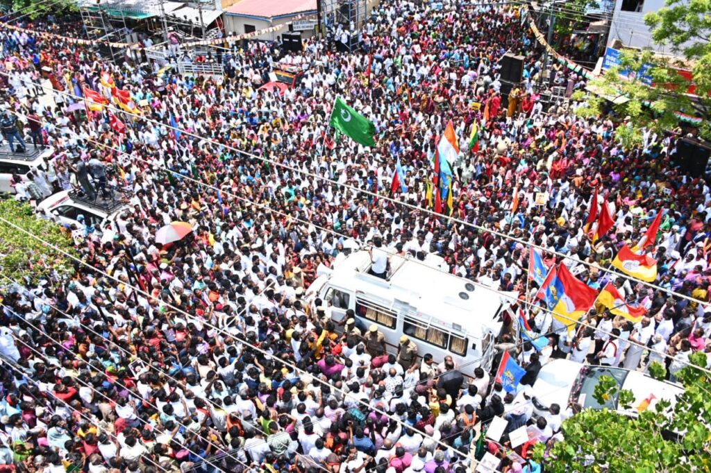 இந்திய யூனியன் முஸ்ஸீம்லீக் மாவட்ட தலைவர் மீராசா, மாநகர் மாவட்ட காங்கிரஸ் தலைவர் முரளிதரன், மக்கள் நீதிமய்யம் மாவட்ட செயலாளர் ஜவஹர், சிபிஐ மாவட்ட செயலாளர் கரும்பன், சிபிஎம் மாவட்ட செயலாளர் ஆறுமுகம், தமிழக வாழ்வுாிமை கட்சி மாவட்ட செயலாளர் கிதர்பிஸ்மி, விடுதலை சிறுத்தை கட்சி மாவட்டசெயலாளா் கணேசன், திராவிடர் தமிழர் கட்சி மாவட்ட செயலாளர் ஹேமா, மனித நேய மக்கள் கட்சி மாவட்ட செயலாளர் அகமது இக்பால், மதிமுக மாநகர செயலாளர் முருகபூபதி, இளைஞர் அணி செயலாளர் சரவணபெருமாள், சிபிஐ நகர செயலாளர் ஞானசேகா், சிபிஎம் நகர செயலாளர் முத்து, உள்பட இந்தியா கூட்டணியை சேர்ந்த பலர் கலந்து கொண்டனர்.