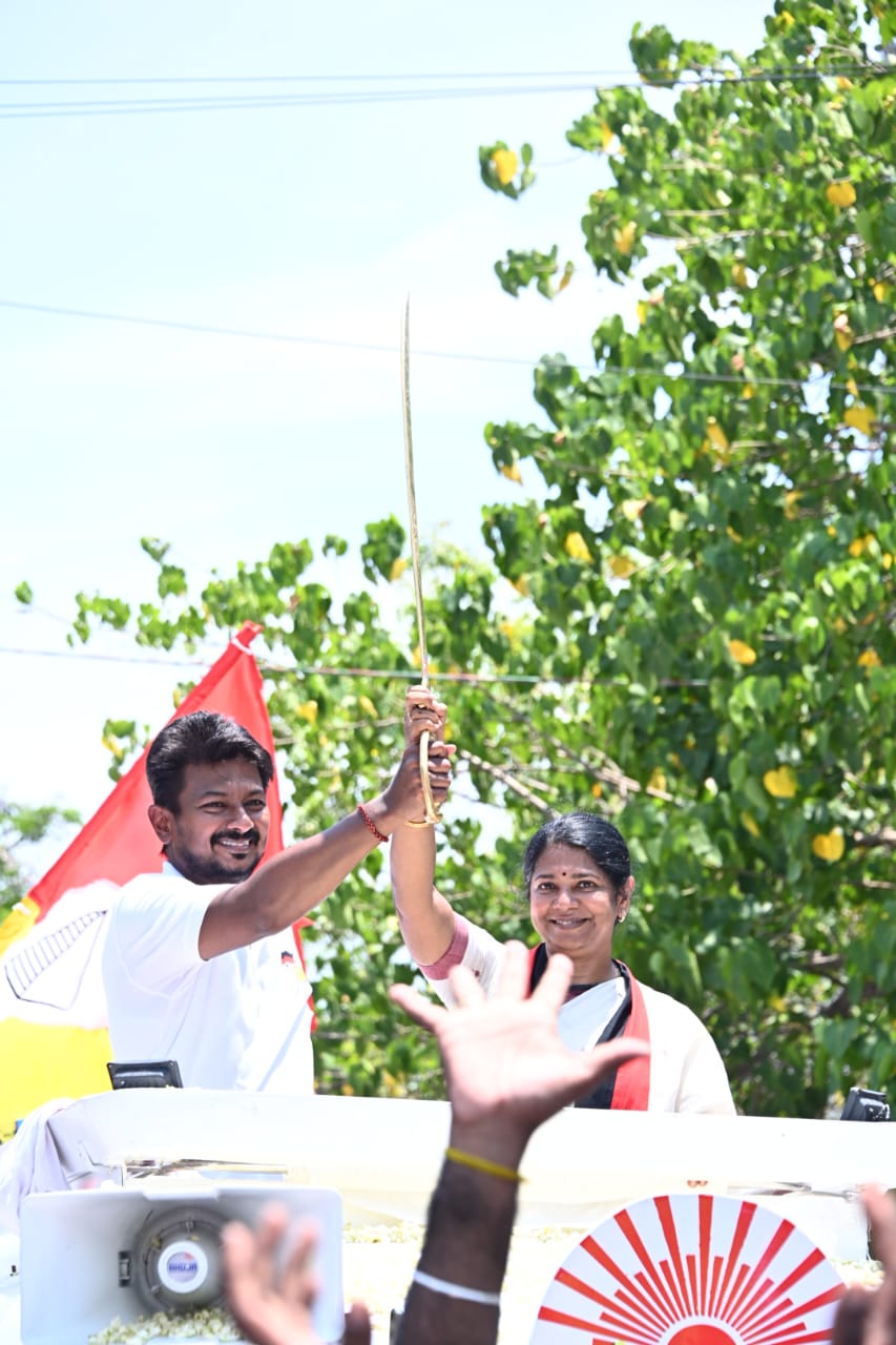பாக்ஸ்: முன்னதாக அமைச்சர் உதயநிதி ஸ்டாலினுக்கு வடக்கு மாவட்ட திமுக செயலாளரும் சமூகநலன் மற்றும் மகளிர் உாிமைத்துறை அமைச்சர் கீதாஜீவன் மாலை அணிவித்து வரவேற்றார். பிரச்சார இடத்திற்கு வந்ததும் கருப்பு சிவப்பு வண்ண தாள்கள் வெடியின் மூலம் வரவேற்று 201 பெண்கள் கும்பத்துடன் மாியாதை வழங்கி மலர்தூவி அமைச்சர் உதயநிதி ஸ்டாலின், கனிமொழிக்கு உற்சாக வரவேற்பு அளித்தனர். அண்ணாநகர் பகுதி திமுக செயலாளர் ரவீந்திரன், மாநகர இளைஞர் அணி அமைப்பாளா் அருண்சுந்தர் ஆகியோர் வீரவாள் வழங்கினார்கள். உதயநிதிஸ்டாலின் நற்பணி மன்ற மாவட்ட தலைவர் துரை, துணைத்தலைவர் டைகர் வினோத், ஆகியோர் ஆளுயர ரோஜாப்பூ மாலை அணிவித்தனர். வேட்பாளர் கனிமொழி ஆரம்பம் முதல் கடைசி வரை அனைவரையும் கும்பிட்டும் சிாித்த முகத்தோடு புன்னகையிட்டவாறு அனைவரையும் உதயசூாியன் சைகை மூலம் உற்சாகப்படுத்தி கொண்டிருந்தார்.