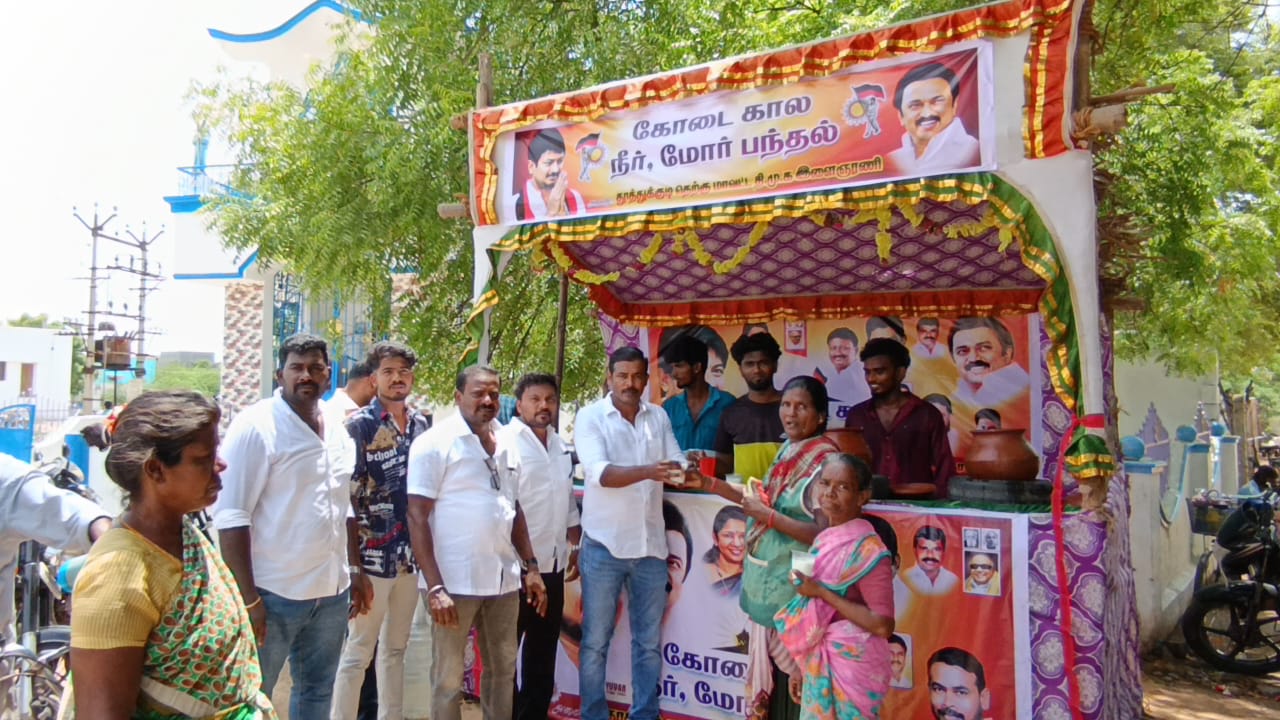 கோடைவெயில் வாட்டி வதைக்கும் இந்த நேரத்தில் தமிழகம் முழுவதும் பொதுமக்களின் தாகத்தை தீர்க்கும் வகையில் நீர் மோர் பந்தல்கள் அமைக்க வேண்டும் என்று திமுக தலைவரும் தமிழக முதலமைச்சருமான மு.க.ஸ்டாலின், மாநில இளைஞர் அணி செயலாளரும் விளையாட்டு மேம்பாட்டு துறை அமைச்சருமான உதயநிதிஸ்டாலின் ஆகியோர் உத்தரவிட்டிருந்தனர்.