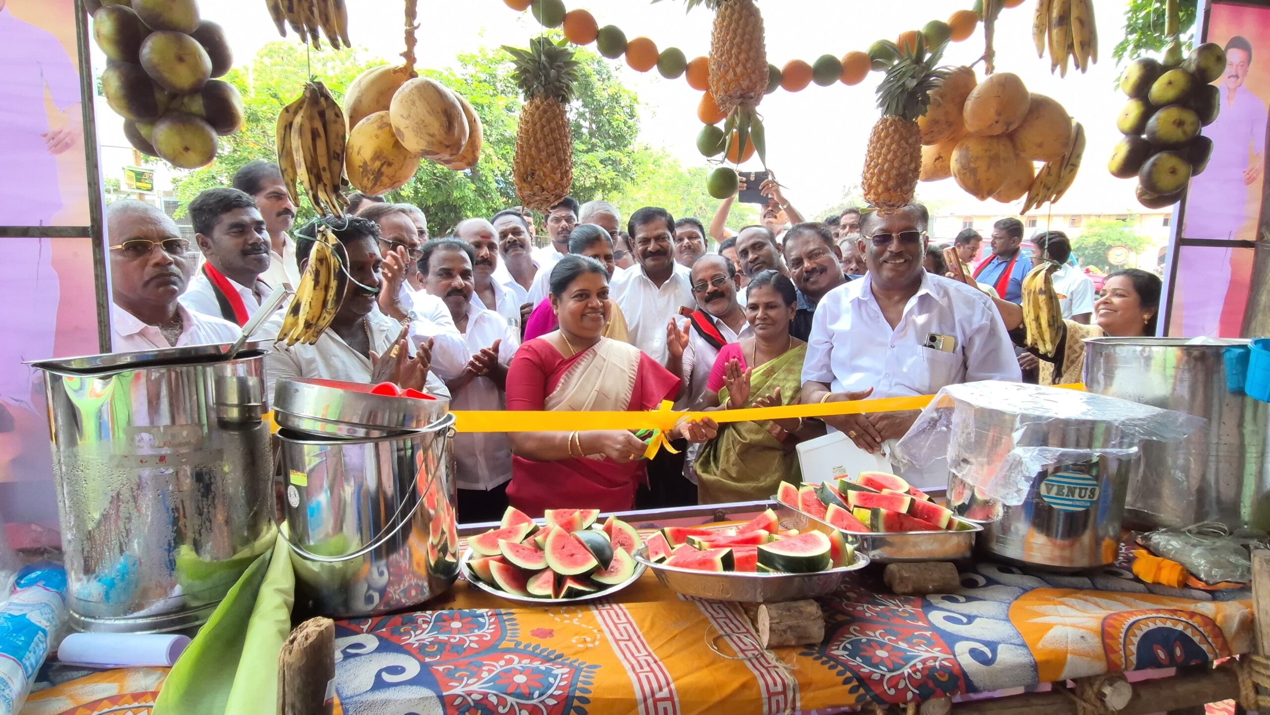 அதன்படி தூத்துக்குடி வடக்கு மாவட்ட திமுக சார்பில் மாதாகோவில் அருகில் அமைக்கப்பட்டிருந்த நீர் மோர் பந்தல் திறப்புக்கு மாநில மீனவரணி துைண செயலாளர் துறைமுகம் புளோரன்ஸ், சிதம்பரநகர் 36வது வட்ட திமுக செயலாளர் செல்வராஜ், பிரையண்ட்நகா் 44வது வட்ட திமுக செயலாளர் சுப்பையா, திரேஸ்புரம் மாநகராட்சி மண்டலத்தலைவர் நிர்மல்ராஜ், ஆகியோர் ஏற்பாடு செய்திருந்து 4 இடங்களில் வடக்கு மாவட்ட திமுக செயலாளரும் சமூகநலன் மற்றும் மகளிர் உாிமைத்துறை அமைச்சருமான கீதாஜீவன், மேயர் ஜெகன் பொியசாமி திறந்து வைத்து மோர், சர்பத், கரும்புசாா், நுங்கு, இளநீர், எலுமிச்சை ஜூஸ், ரஸ்னா, உள்ளிட்ட குளிர்பானங்கள், மற்றும் தர்பூசணி பழம், வாழைப்பழம், செவ்வாழை, அண்ணாசிபழம், பலாப்பழம், போன்ற பழவகைகளையும் பொதுமக்களுக்கு வழங்கினார்.