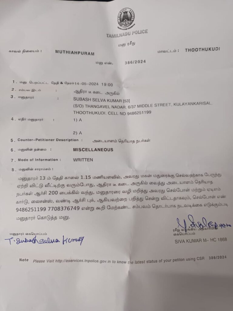 சமீபத்தில் நடந்த சம்பவம் அப்பகுதியில் பெரும் பரபரப்பையும், அதிர்ச்சியையும் ஏற்படுத்தியுள்ளது. முள்ளக்காடு, ஆதிரா டீ கடை அருகில் 13.05.2024 அன்று காலை 1.15 மணியளவில் குலையன்கரிசலை சார்ந்த சுபாஷ் என்பவர் சாண்டி பாலிடெக்னிக் கல்லூரி சாலை வழியாக சென்றுள்ளார். அவரை 3 பேர் கொண்ட கும்பல் பைக்கில் வழி மறித்து, அரிவாள், கத்தி மற்றும் கொடூர ஆயுதங்களை காட்டி அவரிடமுள்ள 3 பவுன் தங்க மோதிரத்தை பறிக்க முயற்சித்துள்ளனர். அதை அவர் தடுத்ததால் அவரை அரிவாளை கொண்டு வெட்ட துணிந்துள்ளனர். சுதாரித்துக் கொண்ட சுபாஷ், அரிவாளை கையை கொண்டு தடுத்துள்ளார். இதனால் சுபாஷ்-க்கு கையில் அரிவாள் வெட்டு விழுந்துள்ளது. அந்த தங்க மோதிரம் கழட்ட முடியாமல் போனதால், அவரிடமுள்ள செல்போன், ஏடிஎம் கார்டு, பைக் லைசன்ஸ், ஆர்சி புக், ஆகியவற்றை பறித்து சென்றுள்ளனர். உயிர் தப்பித்த அவர், முத்தையாபுரம் காவல்நிலையத்தில் 14.05.2024 அன்று நேரில் புகார் மனு வழங்கியுள்ளார். (மனு எண்: 386/2024).