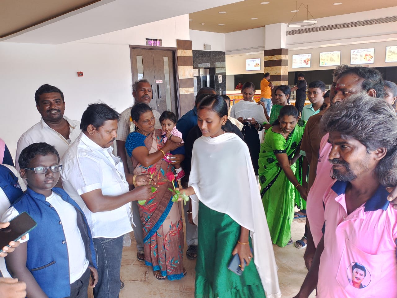 படத்தை காண வருகை தந்த பொதுமக்களுக்கு தூத்துக்குடி மாவட்ட, மாநகர மக்கள் நாயகன் ராமராஜன் தலைமை நற்பணி மன்றம் சார்பாக தூத்துக்குடி மாவட்ட பொறுப்பாளர் காங்கிரஸ் எடிசன் தலைமையில் ரோஜா பூ கொடுத்து வரவேற்றனர்.