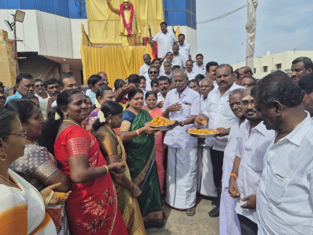 திமுக முன்னாள் முதலமைச்சர் மு.கருணாநிதி 101வது பிறந்தநாளையொட்டி வடக்கு மாவட்ட திமுக சார்பில் எட்டையாபுரம் சாலையில் உள்ள வடக்கு மாவட்ட திமுக அலுவலகம் முன்பு உள்ள கருணாநிதி சிலைக்கு வடக்கு மாவட்ட செயலாளரும் சமூகநலன் மற்றும் பெண்கள் உரிமைத்துறை அமைச்சருமான கீதாஜீவன், மாநகராட்சி மேயர் ஜெகன்பொியசாமி ஆகியோர் மாலை அணிவித்து மலர் தூவி மாியாதை செய்து லட்டு வழங்கினார்கள்.