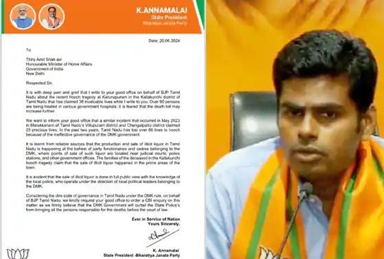கள்ளச்சாராயம் குடித்து 42 பேர் பலியாகி உள்ள சம்பவம் குறித்து மத்தியஅரசு சிபிஐ விசாரணைக்கு உத்தரவிட வேண்டும் என மத்திய உள்துறை அமைச்சர் அமித்ஷாவுக்கு தமிழக பா.ஜ., தலைவர் அண்ணாமலை கடிதம் எழுதி உள்ளார்.