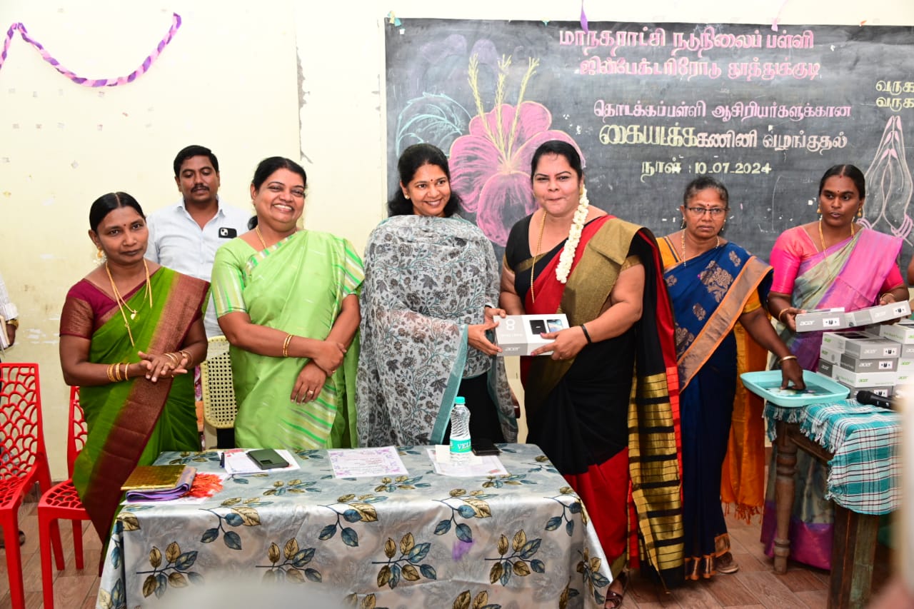 தூத்துக்குடி ஜின் பேக்டரி ரோட்டில் உள்ள மாநகராட்சி நடுநிலைப்பள்ளியில், தொடக்கப்பள்ளி ஆசிரியர்களுக்கான கையடக்க கணினி வழங்கும் நிகழ்ச்சி நடைபெற்றது. உதவி தலைமை ஆசிரியர் ஹேமா பத்ம ஹேனா, தலைமை வகித்தார்.