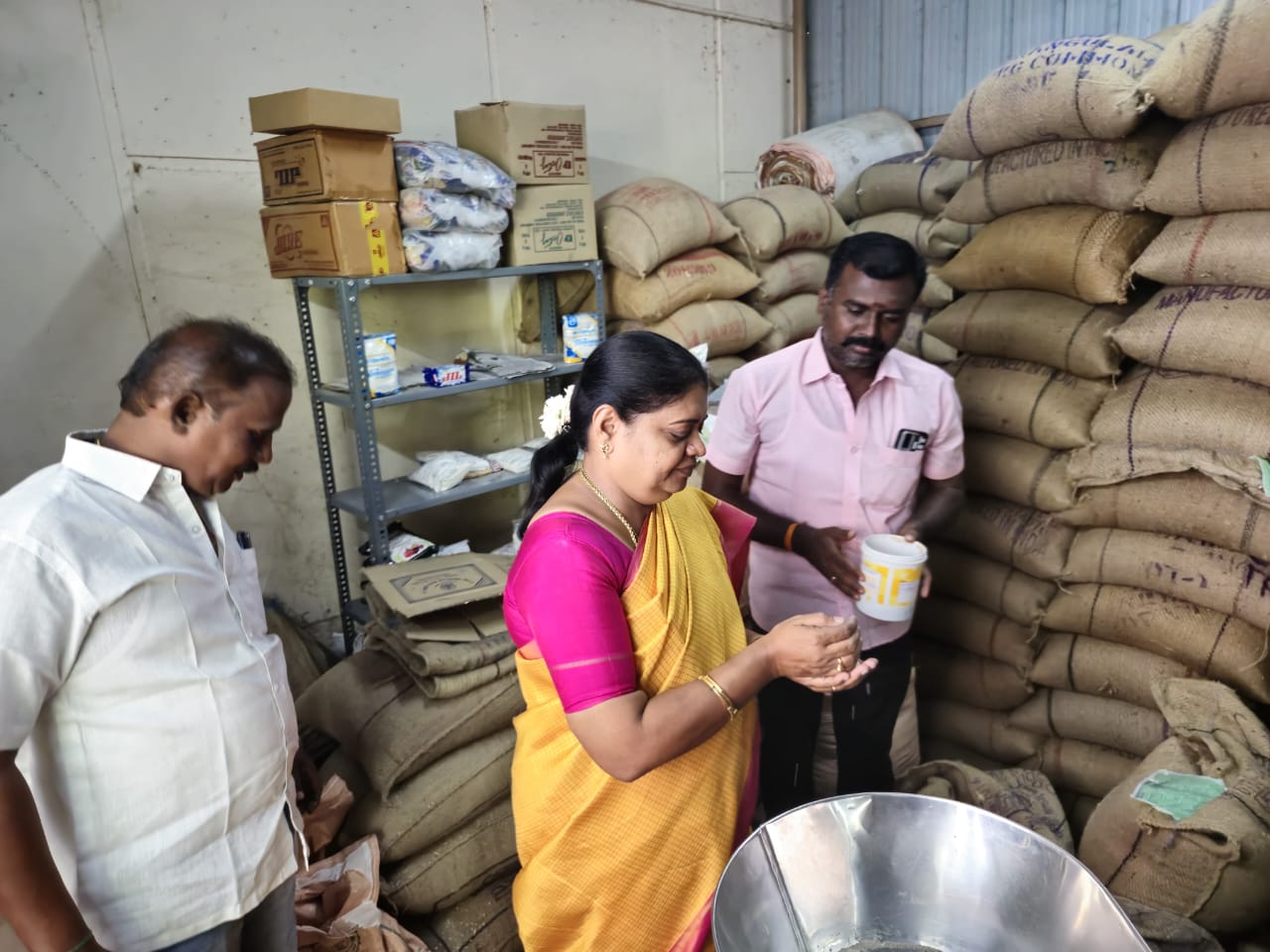 பின்னர் சேமியா உள்பட பொருட்களை எடுத்து ஆய்வு செய்தார். துவரம்பருப்பு பாமாயில் போன்ற பொருட்கள் மக்களுக்கு தட்டுப்பாடு இல்லாமல் வழங்கப்படுகிறதா என்று கேட்டறிந்தார். பாமாயில் துவரம்பருப்பு முழுமையாக வழங்கப்பட்டு வருவதாக ஊழியர் கூறினாா்.