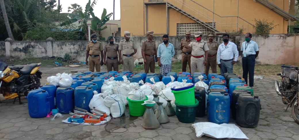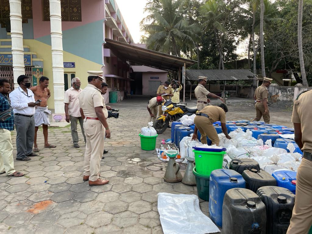 காரைக்கால் மாவட்டம் கோட்டுச்சேரி பகுதியில் ரூபாய் 13 லட்சம் மதிப்புள்ள 3650 லிட்டர் சாராயம் மற்றும் 3 மோட்டார் சைக்கிள்கள் பறிமுதல்