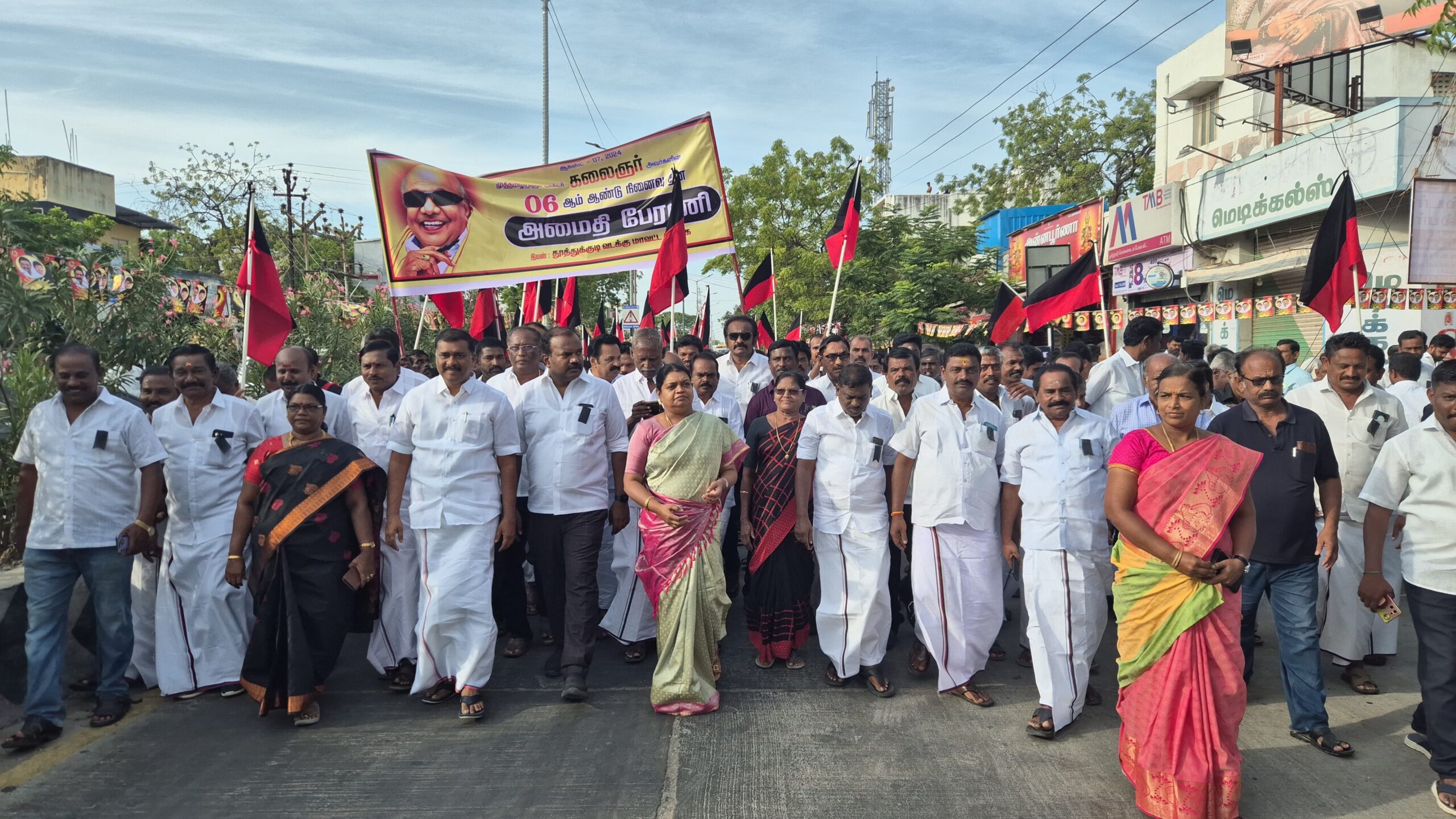 வடக்கு மாவட்ட திமுக சார்பில் நடைபெற்ற அமைதி ஊா்வலத்திற்கு வடக்கு மாவட்ட திமுக செயலாளரும் சமூகநலன் மற்றும் பெண்கள் உரிமைத்துறை அமைச்சருமான கீதாஜீவன் தலைமையில் மார்க்கண்டேயன் எம்எல்ஏ, மாநகர செயலாளர் ஆனந்தசேகரன், மேயர் ஜெகன் பெரியசாமி ஆகியோர் முன்னிலையில் அண்ணாநகரிலிருந்து புறப்பட்டு அலங்கரிக்கப்பட்ட கருணாநிதி படத்துடன் அமைதி ஊர்வலம் நான்காம் கேட் குறிஞ்சிநகர் வழியாக எட்டையாபுரம் சாலையில் வடக்கு மாவட்ட திமுக அலுவலகத்தை சென்றடைந்து அங்குள்ள கலைஞர் சிலைக்கும் அலங்காிக்கப்பட்ட படத்திற்கும் வடக்கு மாவட்ட திமுக செயலாளரும் சமூகநலன் மற்றும் பெண்கள் உரிமைத்துறை அமைச்சருமான கீதாஜீவன் தலைமையில் மார்க்கண்டேயன் எம்எல்ஏ, மாநகர செயலாளர் ஆனந்தசேகரன், மேயர் ஜெகன் பெரியசாமி ஆகியோர் மாலை அணிவித்து மரியாதை செலுத்தினார்கள்.