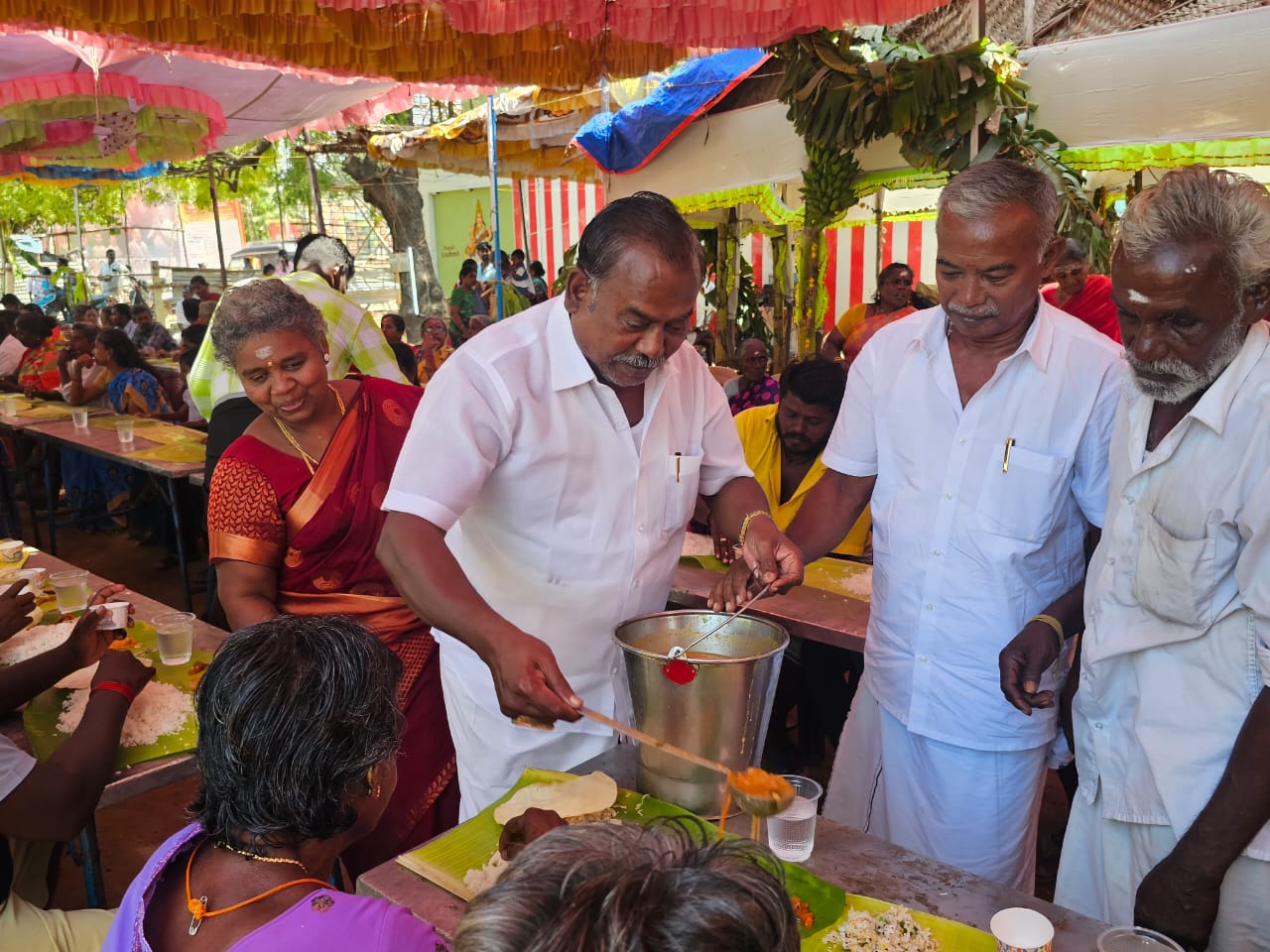 தூத்துக்குடி வடபாகம் கோயில்பிள்ளைவிளை 6 வது வார்டுக்குட்பட்ட ஸ்ரீ சந்தனமாரியம்மன் திருக்கோவில் அஷ்டபந்தன மஹா கும்பாபிஷேக விழாவை முன்னிட்டு நடைபெற்ற அன்னதான நிகழ்ச்சியை அதிமுக வர்த்தக அணி செயலாளரும் முன்னாள் அமைச்சருமான சி.த.செல்லப்பாண்டியன் தொடங்கி வைத்தார்.