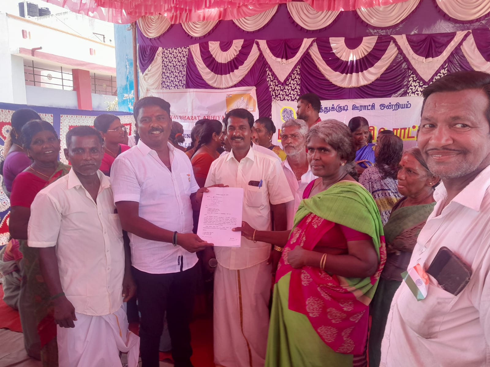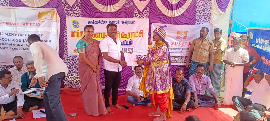 முன்னதாக வீட்டுமனை பட்டா கேட்டு கல்லூாி மாணவி சந்தியா கட்டபொம்மன் வேடமணிந்து ஊராட்சி மன்ற தலைவர் சரவணக்குமாாிடம் கோாிக்கை மனு அளித்தார்.