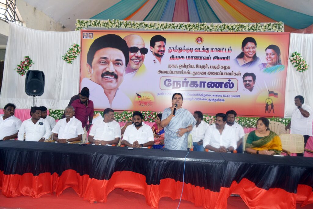 தூத்துக்குடி வடக்கு மாவட்ட திமுக மாணவரணி பொறுப்புக்கான நோ்காணல் எட்டையாபுரம் சாலையில் உள்ள கலைஞர் அரங்கில் நடைபெற்றது. நேர்காணல் நிகழ்ச்சிக்கு வடக்கு மாவட்ட திமுக செயலாளரும் சமூகநலன் மற்றும் மகளிர் உாிமைத்துறை அமைச்சர் கீதாஜீவன் தலைமை வகித்தார். நோ்காணலில் ஓன்றியம் பகுதி பேரூர் கழகத்திற்கு 3 சட்டமன்ற தொகுதிக்குட்பட்ட புதிய மாணவரணி அமைப்பாளர்கள் துணை அமைப்பாளர்கள் நோ்காணல் நடைபெற்றது.