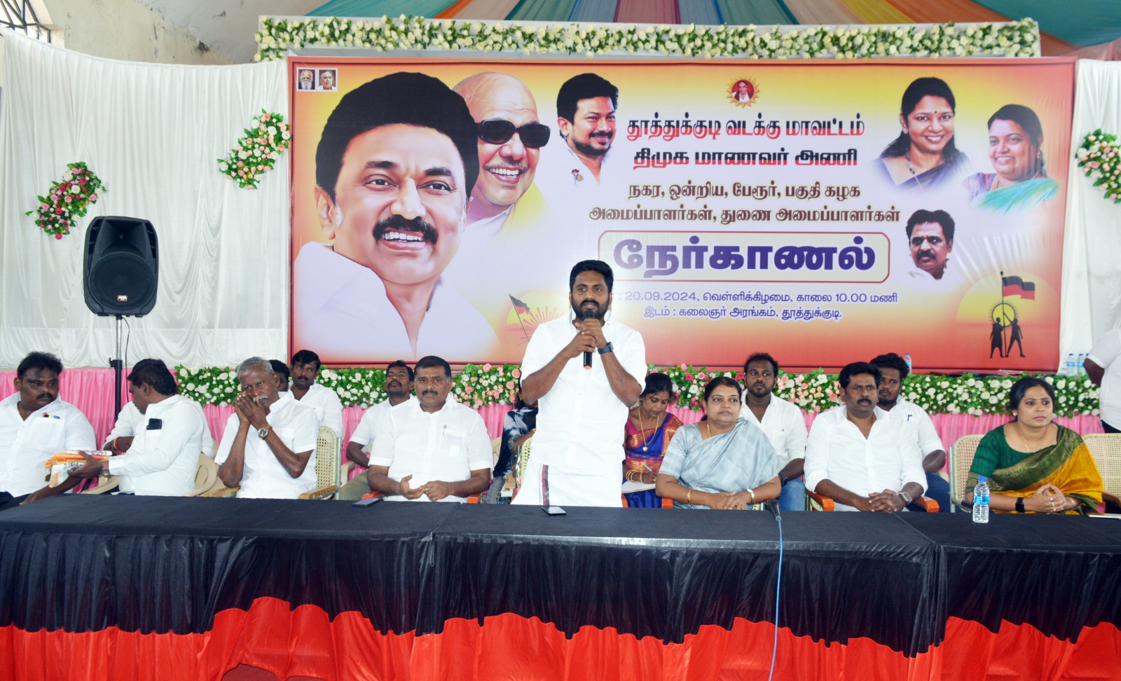 மாநில மாணவரணி தலைவர் வக்கீல் ராஜீவ்காந்தி தொடக்கவுரையாற்றுகையில் ஏற்கனவே வடக்கு மாவட்டத்தில் இதற்கு முன்பு இதே அரங்கில் நடைபெற்ற ஓரு நிகழ்ச்சியில் நான் கலந்து கொண்ேடன். திட்டமிட்டு பணியாற்றுவதில் அமைச்சர் கீதாஜீவன் முன் உதாரணமாக செயல்படுவார்கள் முதலமைச்சரால் பெண்சிங்கம் என்று அழைக்கப்பட்ட அவரது மாவட்டத்தில் முதலமைச்சாின் உத்தரவிற்கிணங்க இளைஞர் அணியை போல் மாணவரணியின் கட்டமைப்பும் உருவாக்க வேண்டும். என்ற கட்டளைக்கிணங்க இந்த பணியை மாணவரணி பொறுப்பேற்று தொடங்கியுள்ளது. முக்கியமாக உறுப்பினர் சேர்க்கை என்பது முதலமைச்சாின் உத்தரவுபடி பிளஸ்ஓன் பிளஸ் டூ மாணவர்களை அதிக அளவில் சோ்க்க வேண்டும். அதிலும் குறிப்பாக அணி அமைப்பாளா்கள் குறைந்த பட்சம் 50 பேரையும் துணை அமைப்பாளா்கள் 25 பேரையும் சேர்க்க வேண்டும். இதற்கு இரண்டு மாத காலம் அவகாசம் கொடுக்கப்படும். அதை முறைப்படுத்தி பணி செய்யாதவர்கள் பட்டியல் மாவட்ட கழகத்திற்கு கொடுக்கப்பட்டு மேல் நடவடிக்கை மேற்காௌ்ளப்படும். இந்த அணியின் துணை அமைப்பாளர்களில் எப்படி மாவட்ட செயலாளரும் அமைச்சருமான கீதாஜீவன் இருக்கின்றார்களோ துைண அமைப்பிற்கு ஐந்தில் இரண்டு பெண்கள் நியமிக்கப்படுவார்கள் இந்த அணியில் இருப்பவர்கள் அண்ணன் தம்பியாகவும் அக்கா தங்கையாகவும் கண்ணியம் தவறாமல் அரசியல் ஆர்வத்தோடு பணியாற்ற வேண்டும். அந்த ஆர்வம் உங்களுக்கு இருக்கிறதா என்பதற்காகதான் இந்த நேர்காணல் நிகழ்வு நடைபெறுகிறது.