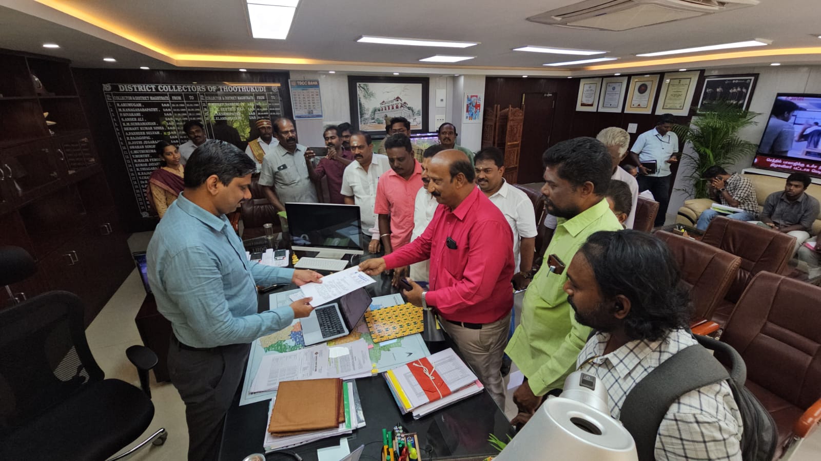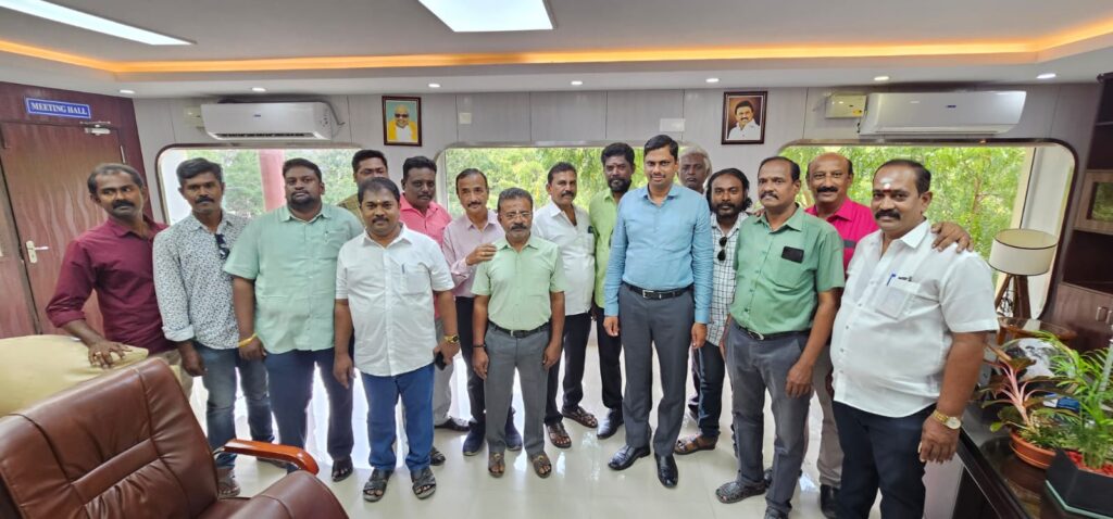 தூத்துக்குடி பிரஸ் கிளப் 2024 – 2026ம் ஆண்டிற்கு தேர்தெடுக்கப்பட்ட புதிய நிர்வாகிகளான தலைவர் சண்முகசுந்தரம் தலைமையில் செயலாளா் மோகன்ராஜ், பொருளாளர் ராஜு, துணைத்தலைவர் சிதம்பரம், உள்ளிட்ட நிர்வாககுழு வைச் சேர்ந்தவர்கள் மரியாதை நிமித்தமாக கலெக்டர் அலுவலகத்தில் கலெக்டர் இளம் பகவத்தை நேரில் சந்தித்து வாழ்த்து பெற்்றனர்.