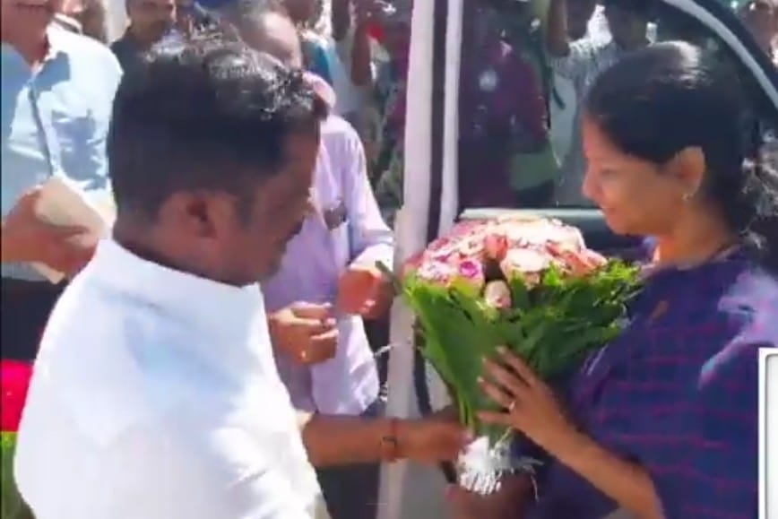 பூங்கொத்து கொடுத்து வரவேற்றார்.