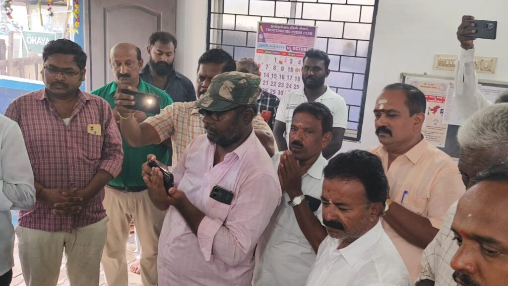தூத்துக்குடி பிரஸ் கிளப் தலைவர் சண்முகசுந்தரம் தலைமையில், செய்தியாளர்கள் தாங்கள் செய்தி சேகரிக்க பயன்படுத்தும் கேமரா, லோகோ,
