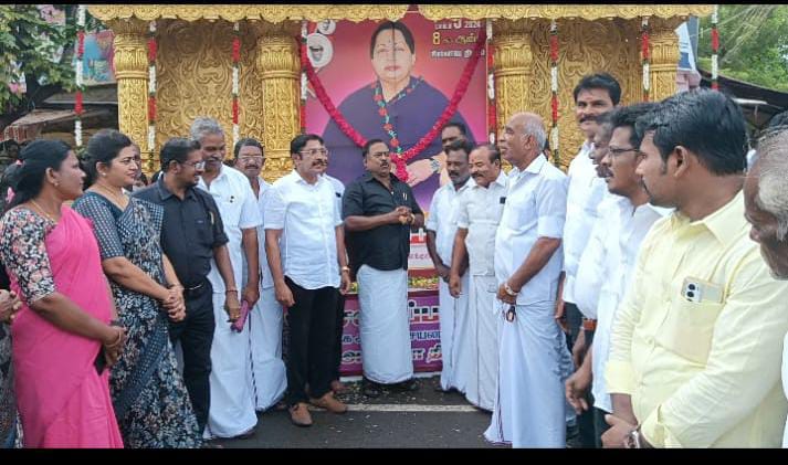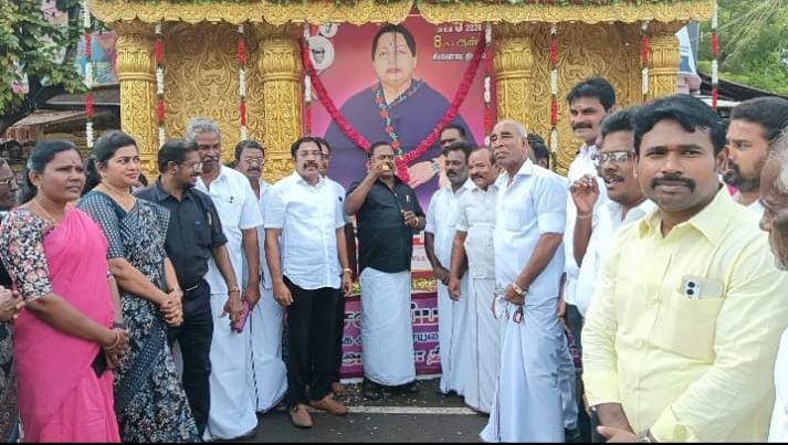 மறைந்த முன்னாள் முதலமைச்சர் ஜெயலலிதாவின் 8ஆம் ஆண்டு நினைவு நாள் இன்று (டிசம்பர் 5) அனுசரிக்கப்படுகிறது. இன்றைய தினம் தமிழ்நாடு முழுவதும் அதிமுகவினர் ஜெயலலிதாவின் படத்துக்கு மாலை அணிவித்து மரியாதை செலுத்துகின்றனர். இந்நிலையில், தூத்துக்குடியில் ஜெயலலிதாவுக்கு புகழஞ்சலி செலுத்தி உறுதிமொழி எடுத்து உள்ளார் அதிமுக முன்னாள் அமைச்சரும், மாநில வர்த்தக அணி செயலாளருமான சி. த செல்ல பாண்டியன் ஜெயலலிதாவின் 8ம் ஆண்டு நினைவு தினத்தை முன்னிட்டு, அதிமுக மாநில வர்த்தக அணி சாா்பில் முன்னாள் அமைச்சரும், மாநில வர்த்தக அணி செயலாளருமான சி.த.செல்லபாண்டியன் தலைமையில் அதிமுகவுணர் இன்று காலை பழைய பேருந்து நிலையம் அருகில் மற்றும் டூவிபுரம் அண்ணாநகர் சந்திப்பு ஆகிய இடங்களில் அலங்காிக்கப்பட்ட ஜெயலலிதா படத்திற்கு மலர் தூவி மாியாதை செய்தார். பின்னர் உறுதி மொழி எடுத்துக் கொண்ட சி. த செல்லப்பாண்டியன் தீயசக்திகளின் ஆட்சியை விரட்டுவோம். அ.தி.மு.க. ஆட்சி மீண்டும் அமைய உறுதிமொழி ஏற்போம் என்று சி.த செல்லப்பாண்டியன் உறுதிமொழி வாசிக்க அதனைத் பின்தொடர்ந்து அதிமுக தொண்டர்கள் கோஷமாக உறுதிமொழி எடுத்தனர்.