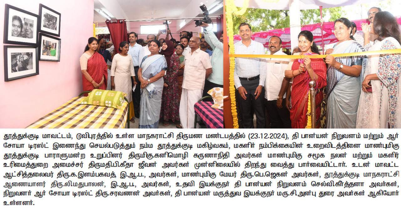 நம்ம தூத்துக்குடி மகிழ்வகம் மகளிர் நம்பிக்கையின் உறைவிடம் திறப்பு விழா தூத்துக்குடி டூவிபுரத்தில் நடைபெற்றது. மீண்டும் இல்லம் திட்டம் துணை இயக்குநர் கீர்த்தனா ராஜகோபால் வரவேற்புரையாற்றினார். தி பேனியன் மருத்துவ இயக்குநர் அன்புதுரை திட்ட விளக்கவுரையாற்றினார்.