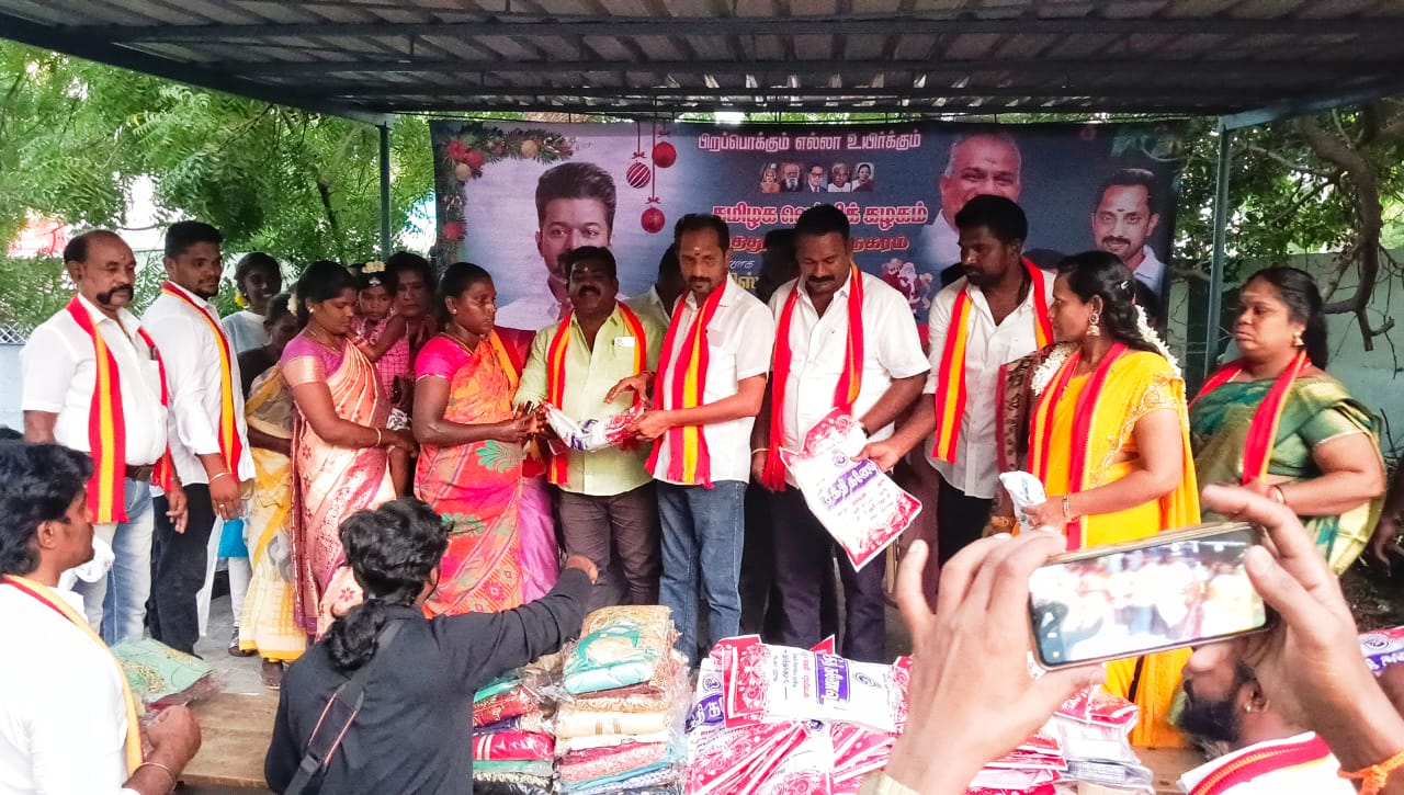 தூத்துக்குடி மாநகர தமிழக வெற்றிக் கழகம் சார்பாக முன்னாள் கவுன்சிலர் ஆனந்தகுமார் ஏற்பாட்டின் பேரில், தென் மண்டல பொறுப்பாளர் சஜி தலைமையில் நடைபெற்ற கிறிஸ்துமஸ் பண்டிகை விழாவை முன்னிட்டு பள்ளி மாணவ, மாணவிகளுடன் கேக் வெட்டி இனிப்புகள் வழங்கி பள்ளி மாணவ, மாணவிகள், தூய்மை பணியாளர்கள் மற்றும் பொதுமக்கள் என 250 பேருக்கு புத்தாடைகள் வழங்கப்பட்டது.