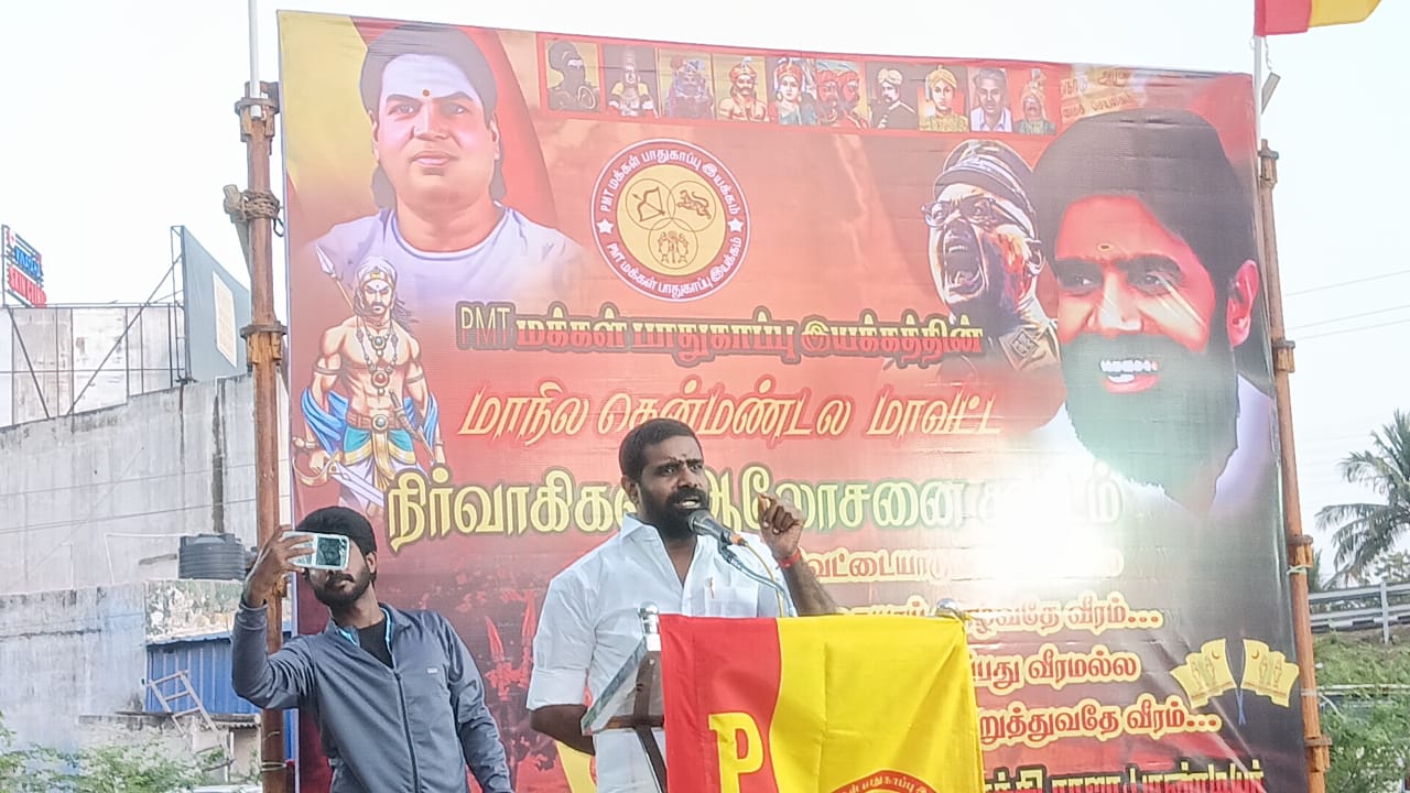 கூட்டத்தில் பேசுகையில் 2026ல் நடைபெறவுள்ள சட்டமன்ற தோ்தலில் பிஎம்டி மக்கள் பாதுகாப்பு இயக்கம் ஆதரவு இல்லாமல் யாரும் ஆட்சி அமைக்க முடியாது. தென் மாவட்டத்தில் உள்ள முக்குலத்தோரை சில பிாிவுகளாக பிாித்து சிலர் குளிர்காய நினைக்கிறார்கள். அப்படி ஏதுவும் எங்களுக்குள் பிாிவினை கிடையாது. அனைத்து தேவர் சமுதாயத்தினரும் ஓரே குடும்பமாகத்தான் வாழ்ந்து வருகிறோம். இனி வரும் காலங்களிலும் அப்படி தான் வாழ்வோம். எங்களுக்கான அடையாளங்களை 2026ல் நாங்கள் வாக்குகளின் மூலம் மற்றவர்களுக்கு எடுத்துக்காட்டும் வகையில் எங்களது செயல்பாடுகள் அமையும். எங்களை புறந்தள்ளிவிட்டு யாரும் அரசியல் செய்ய முடியாது. என்று பேசினார்.