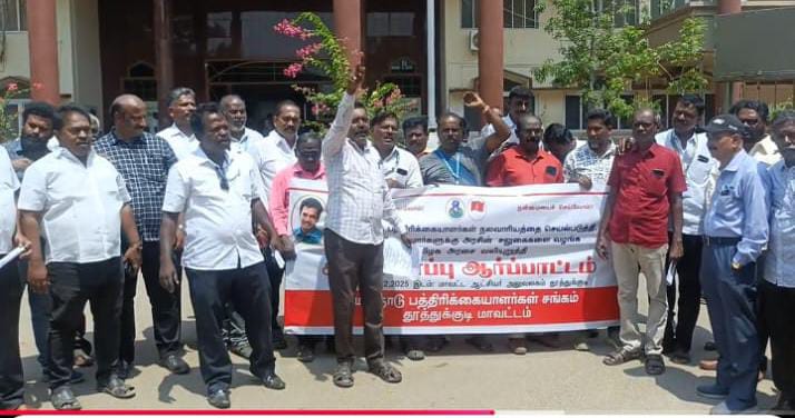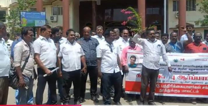 நல வாரியத்தை உடனடியாக நடைமுறைப்படுத்த வேண்டும் என்பது உட்பட பல்வேறு கோரிக்கைகளை வலியுறுத்தி தூத்துக்குடியில் தமிழ்நாடு பத்திரிக்கையாளர்கள் சங்கம் சார்பில் கவன ஈர்ப்பு ஆர்ப்பாட்டம் நடந்தது.