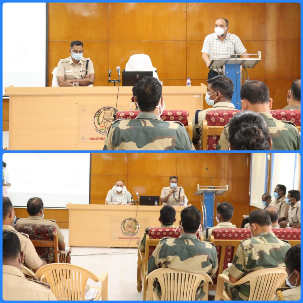 நடைபெற உள்ள தமிழக சட்டமன்ற தேர்தல் பாதுகாப்பை முன்னிட்டு தேர்தல் போலீஸ் பார்வையாளர் திரு. சப்யா சச்சி ராமன் மிஸ்ரா இ.கா.ப மற்றும் தூத்துக்குடி மாவட்ட காவல் கண்காணிப்பாளர் திரு. எஸ். ஜெயக்குமார் M.Sc (Agri) ஆகியோர் தலைமையில் இன்று (21.03.2021) தூத்துக்குடி மாவட்ட காவல்துறை அதிகாரிகளுடன் ஆலோசனை கூட்டம் நடைபெற்றது.