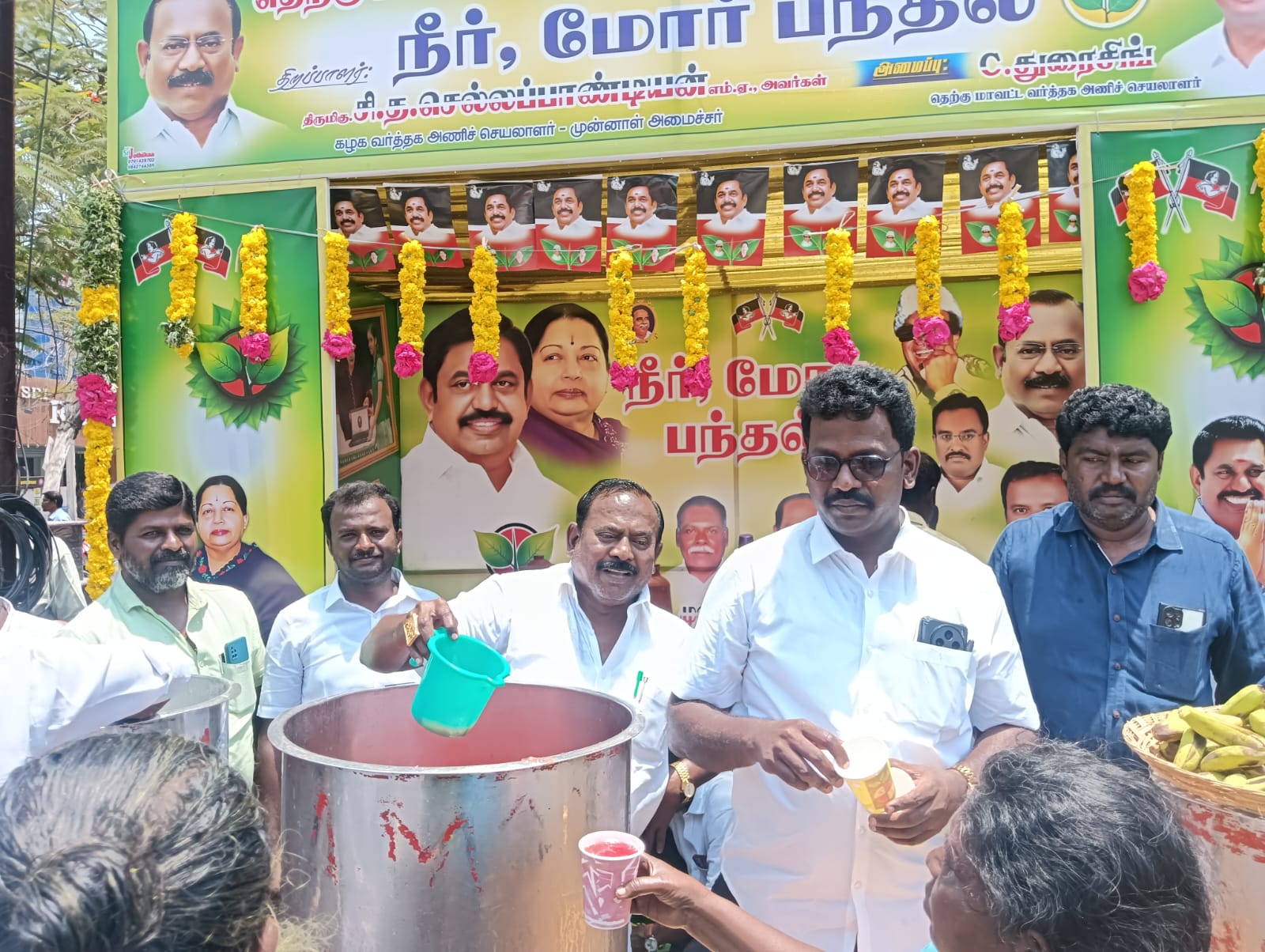 கோடை வெயிலின் தாக்கத்தைத் தணிக்கும் வகையில் அதிமுக சார்பில் நீர் மோர் பந்தலைக் தமிழகம் முழுவதும் திறக்க முன்னாள் முதல்வரும், அதிமுக பொதுச் செயலாளருமான எடப்பாடி பழனிசாமி ஆணைக்கிணங்க அதிமுக சார்பில் பல்வேறு இடங்களில் நீர் மோர் பந்தல் அதிமுகவினரால் திறக்கப்பட்டு