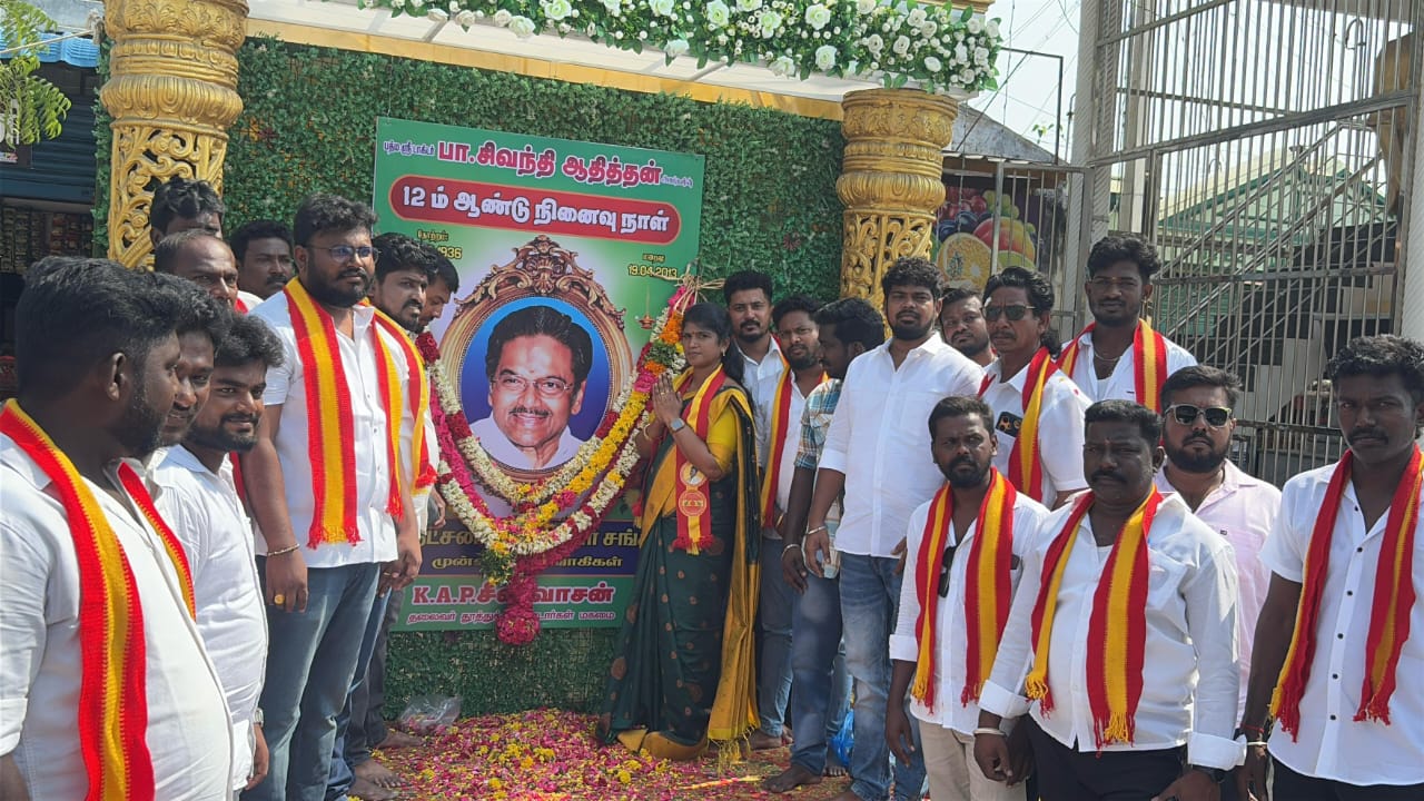 அதன்படி தூத்துக்குடியில் தினத்தந்தி அதிபர் பத்மஸ்ரீ டாக்டர் பா.சிவந்தி ஆதித்தனாரின் 12-ம் ஆண்டு நினைவு தினத்தையொட்டி தூத்துக்குடி அந்தோணியார் கோவில் அருகே உள்ள வ உ சி மார்க்கெட் காமராஜர் சிலை முன்பு அலங்கரிக்கப்பட்ட சிவந்தி ஆதித்தனார் திருவுருவப்படத்திற்கு தமிழக வெற்றி கழகம் சார்பில் மாவட்ட பொறுப்பாளர் அஜிதா ஆக்னல் தலைமையில் ஏராளமான கட்சி நிர்வாகிகள் தொண்டர்கள் கலந்துகொண்டு மாலை அணிவித்து மரியாதை செய்தனர்