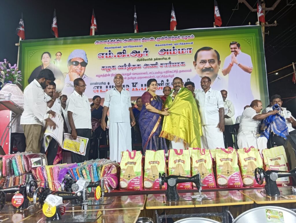 7 வது கட்டமாக எடப்பாடியார் பிறந்தநாள் முன்னிட்டு வர்த்தக அணி சார்பில் ஏழை எளிய பொதுமக்கள் ஆகியோருக்கு சைக்கிள், தையல் இயந்திரம், மிக்ஸி கிரைண்டர், இட்லி குக்கர், குடம், மீன் விற்பனை செய்வதற்கு சட்டி, வேஷ்டி சேலை , அரிசி மற்றும் வீட்டிற்கு தேவையான அனைத்து உபகரண பொருட்களும் மெகா நலத்திட்டமாக முன்னாள் அமைச்சர் செல்லப்பாண்டியன் வழங்கினார். இந்த