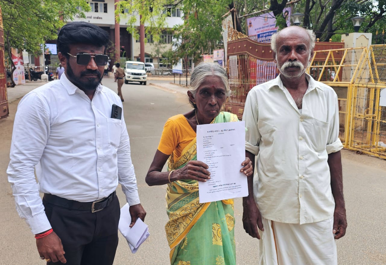 அம்மனுவில் அவர் தெரிவித்துள்ளதாவது: எனது கணவர் வேலாயுதம் மாதவன்குறிச்சியில் பனையேறி பிழைப்பு நடத்தி வருகிறோம். எனக்கு 2 ஆண்கள், 1 பெண் மக்கள் உள்ளனர். அனைவருக்கும் திருமணமாகி வெளியூரில் வசித்து வருகின்றனர். எனது கணவர் மாதவன்குறிச்சியை சார்ந்த ராஜசேகர் என்பவரது பனையை குத்தகைக்கு எடுத்து அதனை செலவு செய்து முள்வேலி அமைத்து பதநீர் எடுத்து வருகிறார். நான் அவருக்கு உதவியாக வேலை செய்கிறேன். இந்த நிலையில் 10.06.2025 அன்று மாதவன்குறிச்சியைச் சார்ந்த திரட்டிமுத்து நாடார் மகன் சுயம்புலிங்கம் மற்றும் அமராபுரத்தைச் சார்ந்த பேச்சிமுத்து என்ற முட்டைகோஸ் ஆகியோர்கள் காலை 9.30 மணியளவில் வந்து எனது முள்வேலி அப்புறப்படுத்தி எங்களுக்கு தெரியாமல் திருட்டுத்தனமாக பதநீர் இறக்கி குடித்துக் கொண்டிருந்தார். அந்த சமயம் நானும் எனது கணவரும் வந்து ஏன் இப்படி சட்டமுறணாக அத்துமீறி நுழைந்து திருட்டுத்தனமாக முள்வேலியை அப்புறப்படுத்தி பதநீரை திருடுகிறீர்கள் என கேட்டதற்கு, அப்படி தான்டா செய்வேன், அனாதை பயல, தேவடியா பயல, உன்னை அடித்தால் இந்த ஊர்ல எவன்டா கேட்பான், என்று சுயம்புலிங்கமும், முட்டை கோஸும் கூறிக்கொண்டு எனது கணவரை அடிக்க பாய்ந்து வந்தனர். உடனே நான் ஏன் இவ்வாறாக அராஜகம் செய்கிறீர்கள் என கேட்டதற்கு என்னை வயதான பெண் என்றும் பாராமல் பேச்சிமுத்து என்ற முட்டைகோஸ் என்னை பார்த்து கூதி மொவள மரியாதையா உன் புருஷனை இங்கிருந்து கூட்டிட்டு போகன்னா உன்னையும், உனது கணவரையும் வெட்டி கொன்று பனைமரத்திற்கு உரமாக வைத்து விடுவேன் என்று கையில் பாலை அரிவாளை வைத்துக் கொண்டு கொலை மிரட்டல் விடுத்தார்.
