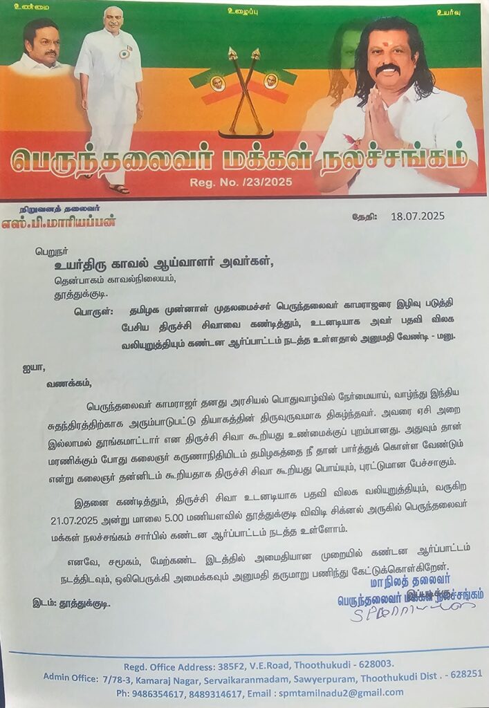 காவல்துறையினரிடம் ஆர்ப்பாட்டம் நடத்த அனுமதி வேண்டி பெருந்தலைவர் மக்கள் நலச் சங்கம் அமைப்பு எஸ்.பி மாரியப்பன் தூத்துக்குடி தெற்கு காவல் நிலையத்தில் மனு ஒன்றை அளித்துள்ளார்.. அவர் அளித்த மனுவில் தெரிவித்துள்ளதாவது பெருந்தலைவர் காமராஜர் தனது அரசியல் பொதுவாழ்வில் நேர்மையாய் வாழ்ந்து இந்திய சுதந்திரத்திற்காக அரும்பாடுபட்டு தியாகத்தின் திருவுருவமாக திகழ்ந்தவர். அவரை ஏசி அரை இல்லாமல் தூங்க மாட்டார் என திருச்சி சிவா கூறியது உண்மைக்கு புறம்பானது.அதுவும் தான் மரணிக்கும் போது கலைஞர் கருணாநிதி இடம் காமராஜர் தமிழகத்தை நீ தான் பார்த்துக் கொள்ள வேண்டும் என்று கூறியதாக கலைஞர் தன்னிடம் கூறினார் என திருச்சி சிவா கூறியது பொய்யும், புரட்டுமான ஆதாரம் அற்ற பேச்சு ஆகும்..இதனை கண்டித்தும், திருச்சி சிவா உடனடியாக பதவி விலக வலியுறுத்தியும் வருகின்ற (21/7/2025) மாலை 5 மணி அளவில் தூத்துக்குடி விவிடி சிக்னல் அருகில் பெருந்தலைவர் மக்கள் நலச்சங்கம் அமைப்பு சார்பில் மாபெரும் கண்டன ஆர்ப்பாட்டம் நடத்த இருப்பதாகவும் எனவே சமூக மேற்கொண்ட இடத்தில் அமைதியான முறையில் கண்டன ஆர்ப்பாட்டம் நடத்திடவும் ஒலிபெருக்கி அமைக்கவும் அனுமதி தருமாறு கேட்டுக் கொள்கிறேன் என்று பெருந்தலைவர் மக்கள் நலச் சங்கம் அமைப்பு எஸ்.பி மாரியப்பன் அவர் அளித்த மனுவில் தெரிவித்துள்ளார்.