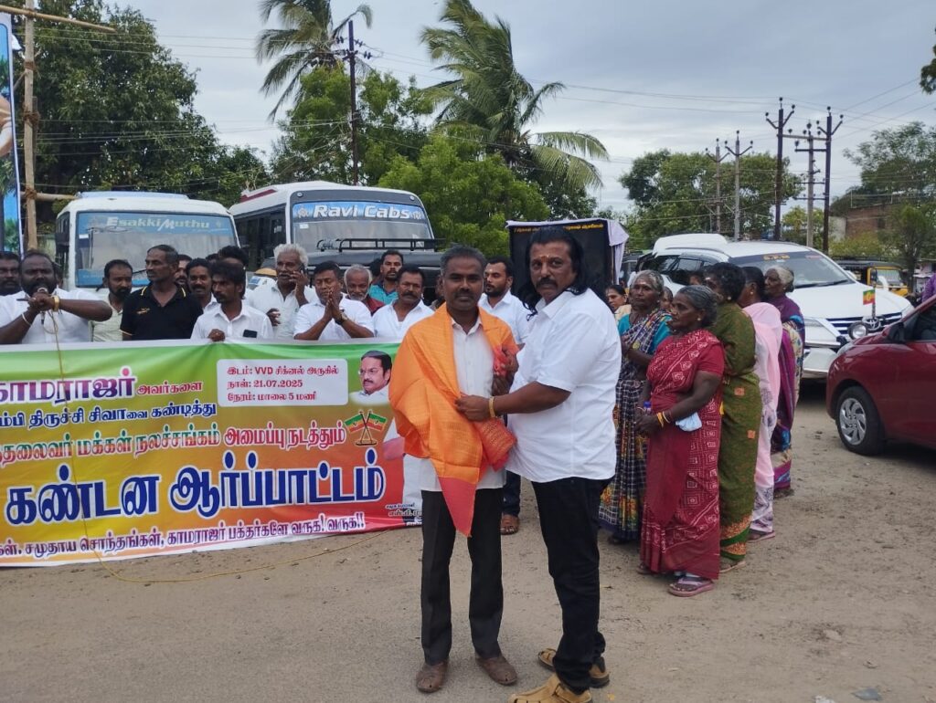இந்த போராட்டத்தில் அனைத்து கட்சி நிர்வாகிகள், சமுதாய பிரமுகர்கள், பெருந்தலைவர் காமராஜர் பக்தர்கள் என பலர் திரளாக கலந்து கொண்டு திருச்சி சிவா மீது எந்த நடவடிக்கையும் எடுக்காத திராவிட மாடல் அரசுக்கு எதிராகவும், காமராஜர் குறித்து இழிவாக பேசிய திருச்சி சிவா எம்பி-யை கண்டித்தும் அவர் பதவியை நீக்க கோரி கண்டன கோஷங்களை எழுப்பி ஆர்பாட்டத்தில்.