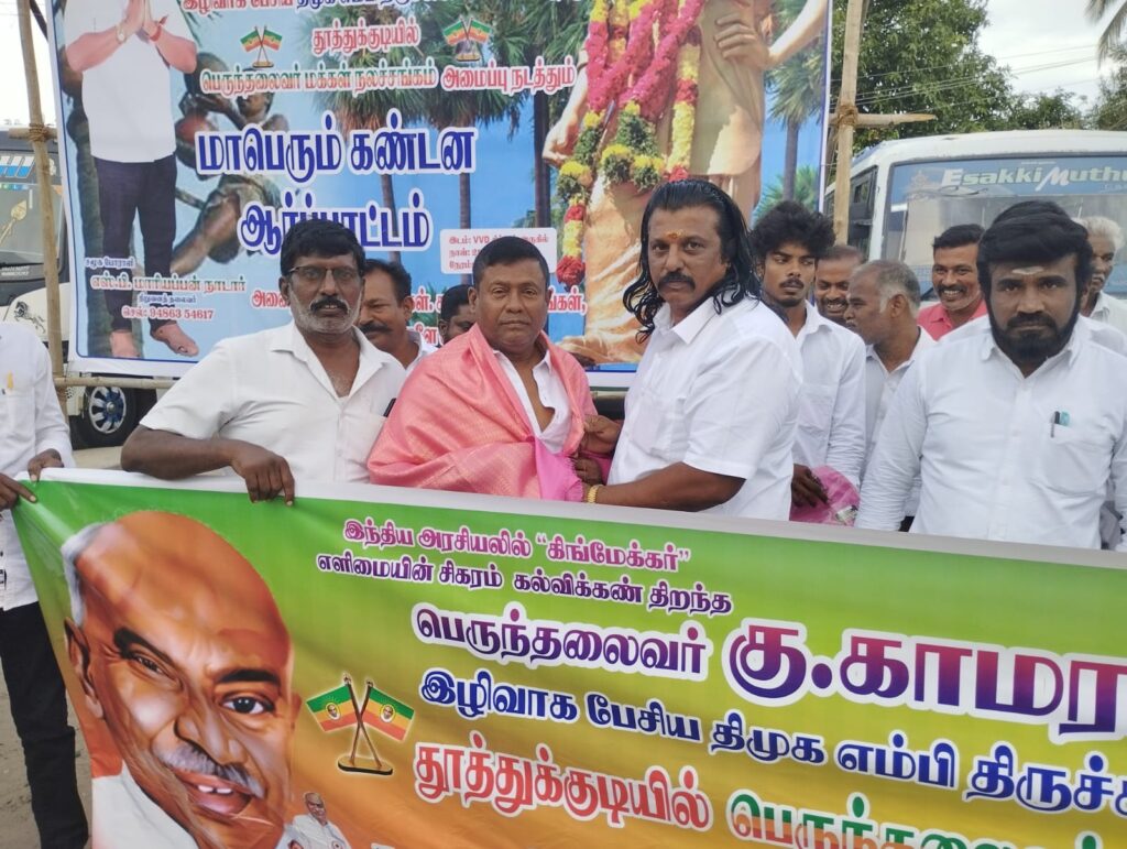 இந்நிலையில், தூத்துக்குடியில் நடைபெற்ற கண்டன ஆர்ப்பாட்டத்திற்கு பெருந்தலைவர் மக்கள் நலச்சங்கம் அமைப்பு நிறுவனத் தலைவர் எஸ்.பி. மாரியப்பன் தலைமை தாங்கினார்.