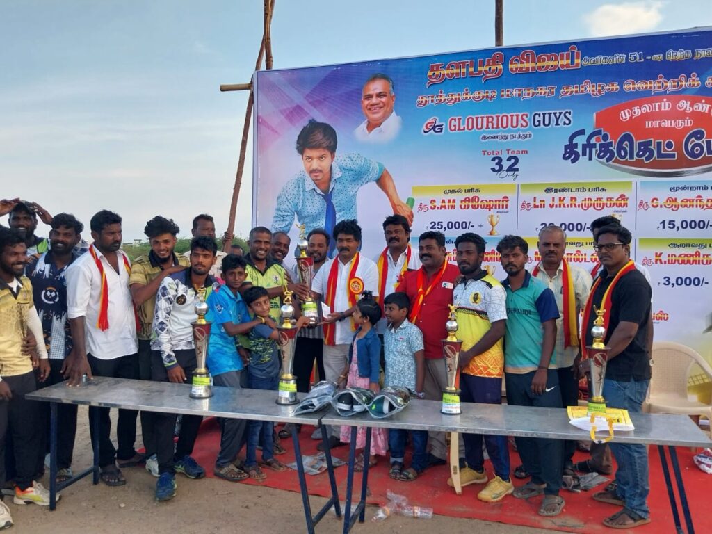 தமிழக வெற்றிக்கழக தலைவரும் நடிகருமான விஜய் 51வது பிறந்தநாளை முன்னிட்டு பொதுச்செயலாளர் ஆனந்த் வழிகாட்டுதலின் படி தமிழக வெற்றிக்கழகம் கிளாாியஸ் கைஸ் இணைந்து நடத்தும் முதலாம் ஆண்டு மாபெரும் கிாிக்கெட் போட்டி 19ம் தேதி தொடங்கிய நிலையில் 27 ம் தேதி சங்கரபோி விளையாட்டு மைதானத்தில் 32 அணிகள் கலந்து கொள்ளும் இறுதி போட்டிகள் நடைபெற்றன.