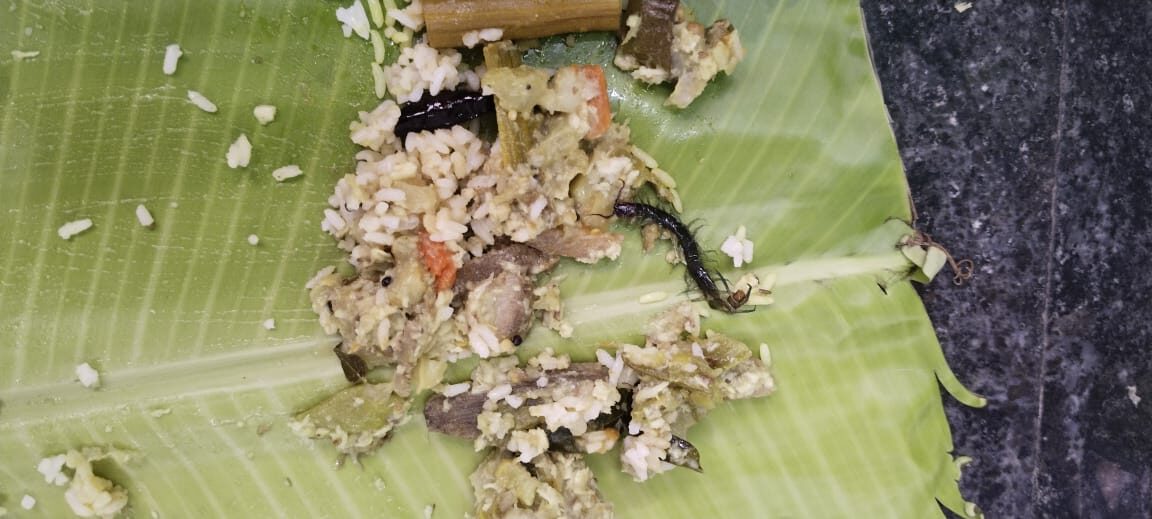 பூரான் கிடந்ததால் அந்த சாப்பாட்டை சாப்பிட்ட கர்ப்பிணி பெண்ணுக்கு வாந்தி மயக்கம் ஏற்பட்டு தீவிர சிகிச்சை பெற்று வருகிறார்.