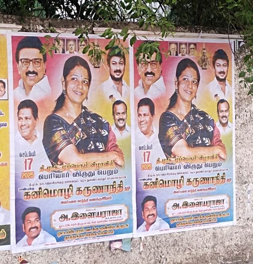இந்த வால்போஸ்டரில்; குறிப்பிட்டிருந்ததாவது: திமுக மும்பெரும் விழாவில் பெரியார் விருது பெறும் முத்தமிழறிஞர், டாக்டர் கலைஞர் அவர்களின் தவப்புதல்வியும் மாண்புமிகு தமிழக முதல்வர் தளபதியார் அவர்களின் அன்பு சகோதரியுமான திமுக நாடாளுமன்ற குழு தலைவரும் கழக துணைப் பொதுச்செயாளருமான மாண்புமிகு கனிமொழி கருணாநிதி எம்.பி. அவர்களை மனதார வாழ்த்துகிறோம். என்றும் அன்புடன் அ.இளையராஜா, ஓட்டப்பிடாரம் திமுக வடக்கு ஒன்றிய செயலாளர், ஓட்டப்பிடாரம் வடக்கு ஒன்றிய திமுக, தூத்துக்குடி தெற்கு மாவட்டம், என்ற வாசகத்தோடு பெரியார், கலைஞர், தமிழக முதல்வர் மு.க.ஸ்டாலின், துணை முதல்வர் உதயநிதி ஸ்டாலின், அமைச்சர் அனிதாராதாகிருஷ்ணன், மேயர் ஜெகன் பெரியசாமி, மாநில நிர்வாகி உமரிசங்கர், செந்தூர்மணி ஆகியோர்கள் படங்களுடன் ஓட்டப்பிடாரம் வடக்கு ஒன்றிய திமுக சார்பில் தூத்துக்குடி மாவட்டம் முழுவதும் ஒட்டப்பட்ட இந்த வால்போஸ்டர்கள் அனைத்து தரப்பினர்கள் பார்வையையும் கவர்ந்தது.