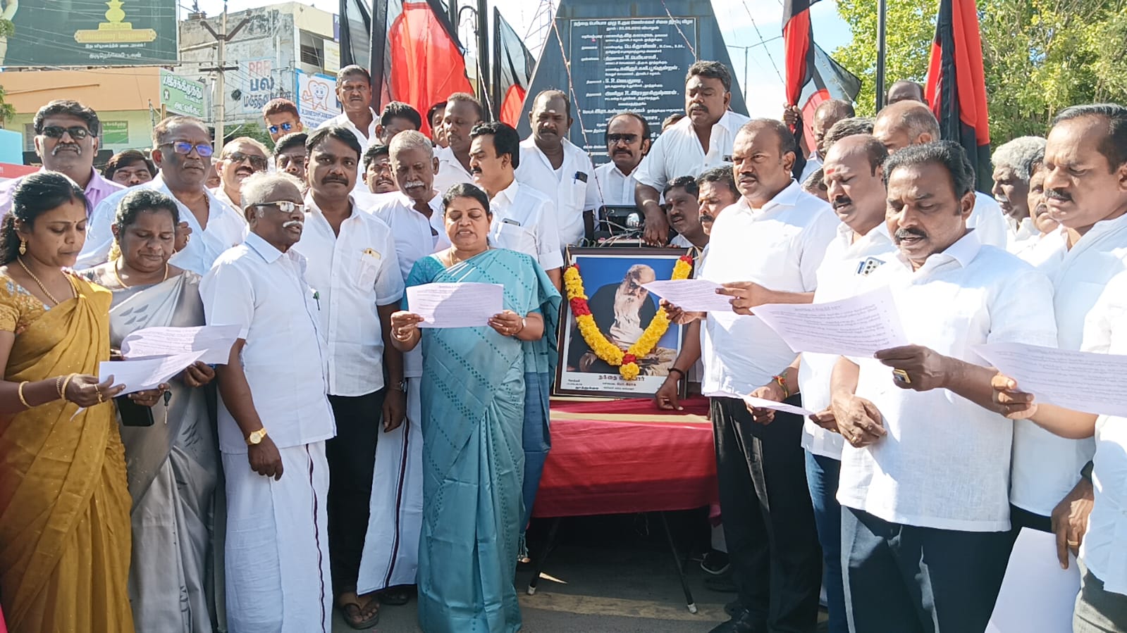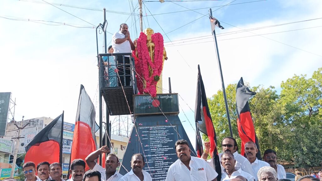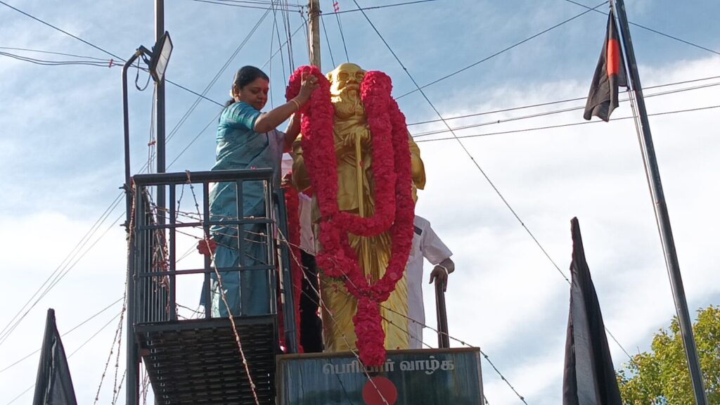 திமுக தலைவரும் தமிழக முதலமைச்சருமான முக.ஸ்டாலின் பெரியார் பிறந்தநாளை சமூகநீதி நாளாக கடைப்பிடிக்க வேண்டும் என்று அறிவித்திருந்தார். அதன்படி தூத்துக்குடி தென்பாகம் காவல்நிலையம் அருகில் உள்ள பெரியார் 147வது பிறந்தநாளையொட்டி அவரது சிலைக்கு வடக்கு மாவட்ட திமுக சார்பில் வடக்கு மாவட்ட தி.மு.க செயலாளரும், சமூகநலன் மற்றும் மகளிர் உரிமைத்துறை அமைச்சர் கீதாஜீவன், மேயர் ஜெகன் பெரியசாமி ஆகியோர் மாலை அணிவித்து மரியாதை செய்து இனிப்புகள் வழங்கி சமூகநீதி நாள் உறுதிமொழி எடுத்துக் கொண்டனர்.