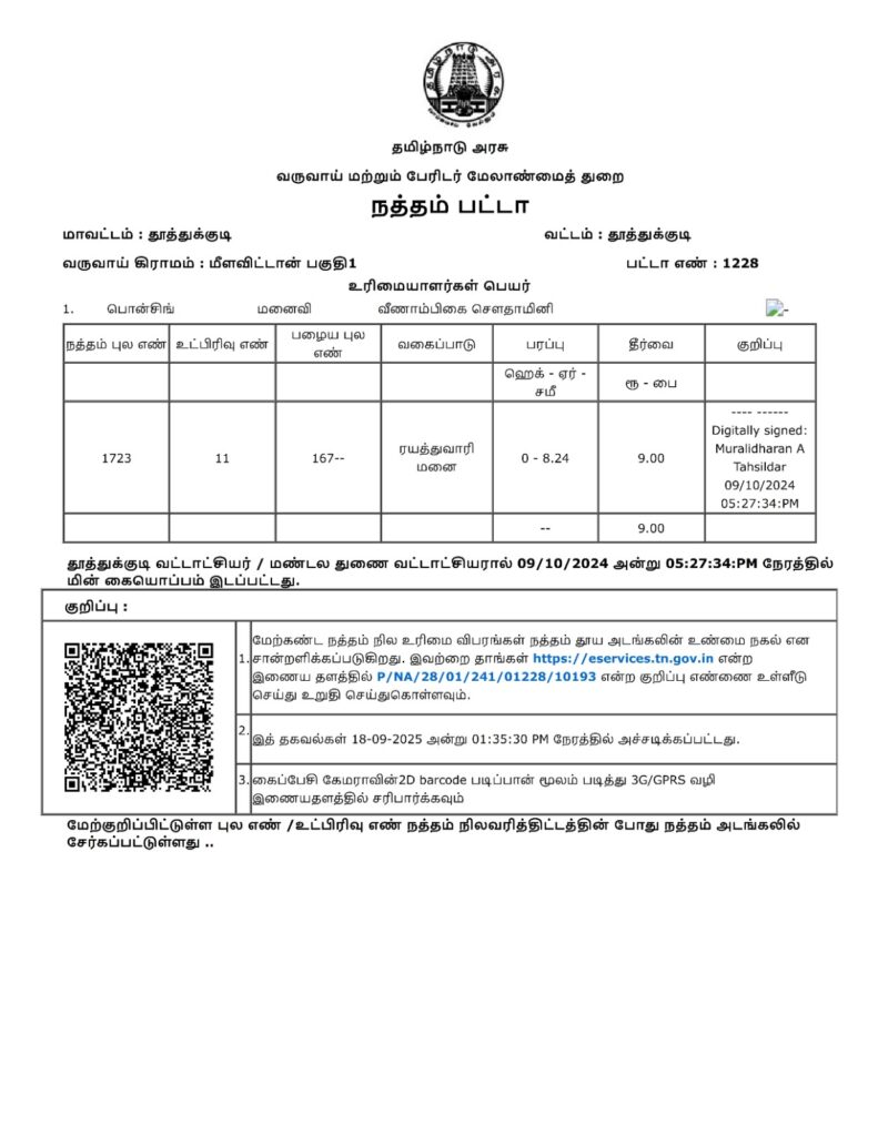 மேலும், மீளவிட்டான் பகுதி 1 கிராமத்தில் நத்தம் புறம்போக்கு இடம் அரசுக்குச் சொந்தமானது. ஆயிரக்கணக்கான இடங்கள் இருந்து வருகிறது. இந்த இடத்தை செல்வாக்கு வசதிமிக்க நபர்கள் ஆளுங்கட்சி துணையுடன் ஆக்கிரமித்து வருகின்றனர். இதில் பொன்சிங் மனைவி வீணாம்பிகை சௌதாமினி என்பவருக்கு தூத்துக்குடி வட்டாட்சியர் முரளிதரன் கடந்தாண்டு 10.10.2024 அன்று 97 செண்ட்க்கு பட்டா வழங்கியுள்ளார். பட்டா எண்: 1233ல் 18 செண்ட் இடம் பட்டா எண் 1231ல் 3 செண்ட் இடம் பட்டா எண்: 1232ல் 8 செண்ட் இடம் பட்டா எண்: 1230ல் 40 செண்ட் இடம் பட்டா எண்: 1229ல் 7 செண்ட் இடம், பட்டா எண்: 1228ல் 21 செண்ட் இடம் ஆக மொத்தம் 97 செண்ட் இடத்தை நத்தம் புறம்போக்கு அரசு இடத்தை தனிநபருக்கு தாரை வார்க்கப்பட்டுள்ளது. இதுதொடர்பாக இராமச்சந்திரன் என்பவர் மாவட்ட கலெக்டர் இளம்பகவத் மற்றும் மாவட்ட குற்றப்பிரிவு, தமிழக முதலமைச்சரின் தனிப்பிரிவு, லஞ்சஒழிப்புத்துறை ஆகியவற்றிற்கு அரசு நத்தம் புறம்போக்கு காலிமனை இடத்தை தனி நபர் ஒருவருக்கு வருவாய்துறை அதிகாரிகள் பட்டா வழங்கியுள்ளனர் அரசு ஆவணமான அ பதிவேட்டில் காலிமனை நத்தம் புறம்போக்கு என்று உள்ளது, கணினியில் பதிவேற்றம் செய்யும்போது தனிநபர் ஒருவருக்கு கணினியில் செய்து பட்டா வழங்கப்பட்டுள்ளது. இதில் தொடர்புடைய அதிகாரிகள் அனைவர் மீதும் நடவடிக்கை எடுக்க வேண்டும் என்று புகார் அளித்துள்ளார். அதே போல கோரம்பள்ளம் கிராமம் பகுதி-2-ல் நத்தம் புறம்போக்கு இடம் 2 ஏக்கர் 37 செண்ட் இடத்திற்கும் அதே நாளில் பட்டா வழங்கப்பட்டுள்ளது என்ற புள்ளி விபரம் மாவட்ட நிர்வாகத்திற்கு தெரிந்து நடந்ததா? அல்லது அதிகாரிகளின் உதவியாளர்கள் உத்தரவின் பேரில் நிறைவேறியதா? என்று சி.த.செல்லபாண்டியன் கேள்வி எழுப்பியுள்ளார்.