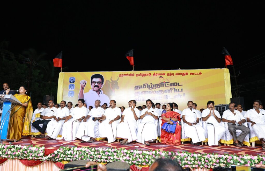 தூத்துக்குடி வடக்கு மாவட்ட திமுக சாா்பில் ஓரணியில் தமிழ்நாடு என்ற தலைப்பில் நடைபெற்ற பொதுக்கூட்டத்திற்கு வடக்கு மாவட்ட திமுக செயலாளரும் சமூகநலன் மற்றும் மகளிர் உாிமைத்துறை அமைச்சர் கீதாஜீவன் தலைமை வகித்தாா். மாா்க்கன்டேயன் எம்.எல்.ஏ, மாநகர செயலாளா் ஆனந்தசேகரன், மேயா் ஜெகன் பொியசாமி ஆகியோா் முன்னிலை வகித்தனா். வடக்கு மாவட்டத்தில் உள்ள