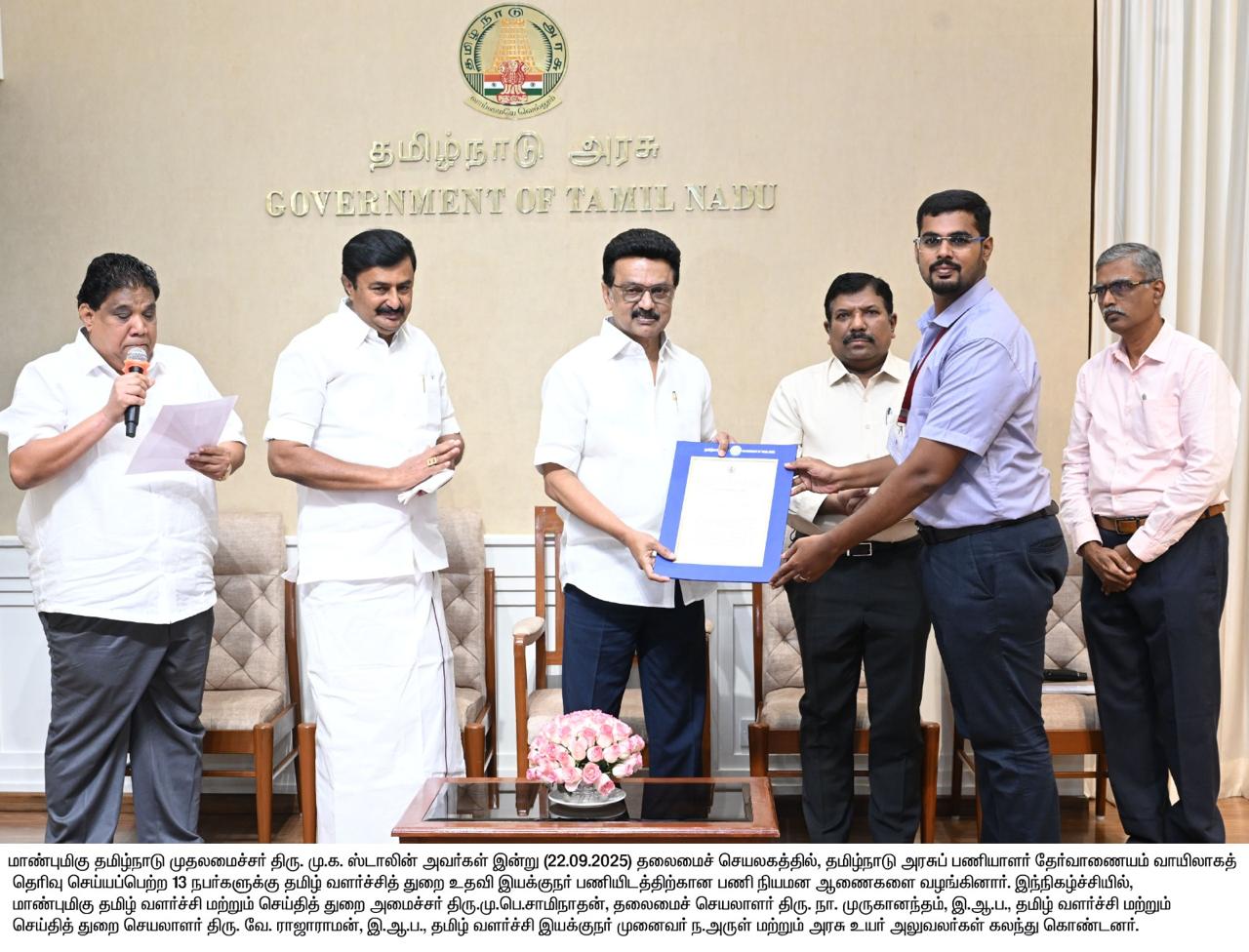 [6:59 PM, 9/22/2025] Sakthivel MP: இளங்கலை மற்றும் முதுகலை தமிழிலக்கியம் பயின்ற மாணவர்களுக்கு தமிழ்நாடு அரசுப் பணியாளர் தேர்வாணையம் வாயிலாக தேர்வு மற்றும் நேர்காணல் நடத்தப்பட்டு, தெரிவு செய்யப்பட்ட 13 நபர்களுக்கு உதவி இயக்குநர் பணியிடத்திற்கான பணி நியமன ஆணைகளை மாண்புமிகு தமிழ்நாடு முதல்-அமைச்சர் இன்றையதினம் வழங்கினார். தமிழ் இலக்கியக் கல்வி கற்றவர்கள் தமிழ் வளர்ச்சித் துறையின் உதவி இயக்குநர்களாகப் பணி வாய்ப்புப் பெற்றுள்ளது தமிழுக்கான நற்காலம் மட்டுமல்ல பொற்காலமுமாகும்.